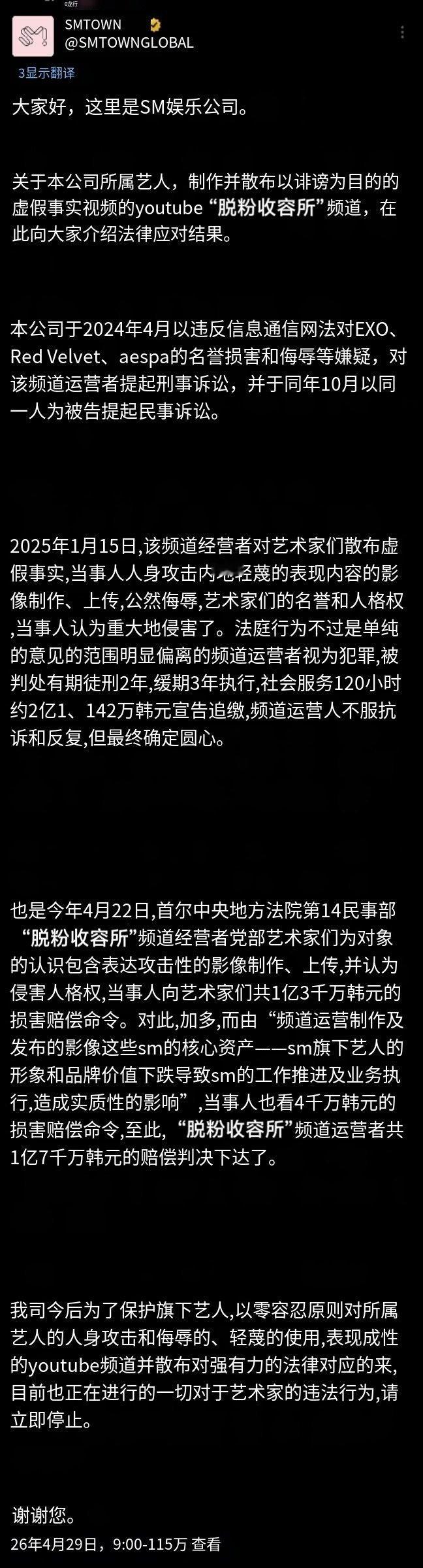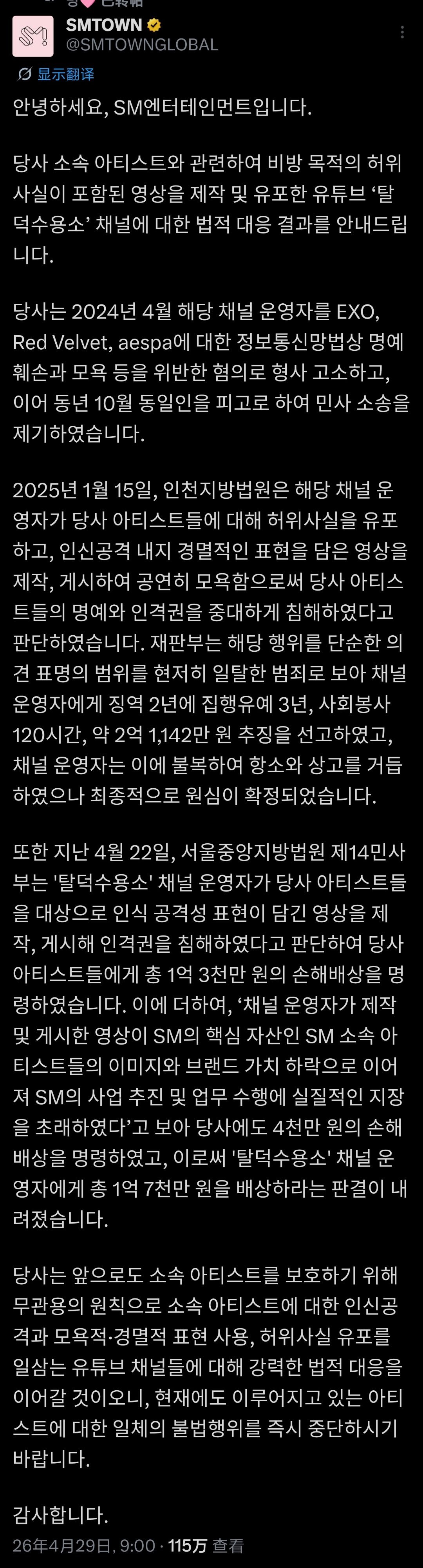 SM表示:“今后将继续对非法行为、犯罪行为、人身攻击、侮辱性言论及虚假信息的传播采取强有力的法律措施,以保护所属艺人。”