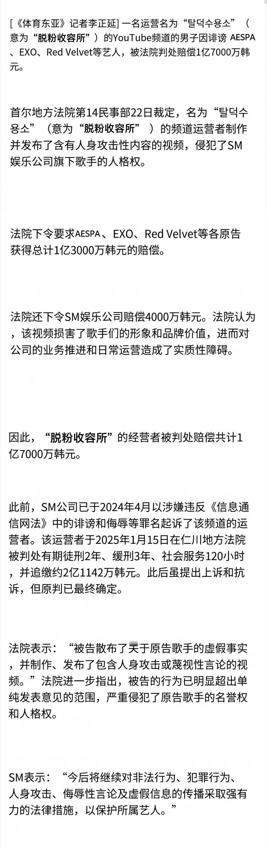 “脱粉收容所”需向SM赔偿1.7亿韩元(78万RMB),并被判处有期徒刑2年、缓刑3年、社会服务120小时及追缴2亿1142万韩元(97万RMB)。