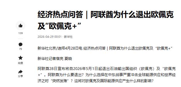 2026年4月28日晚间,阿联酋国家通讯社突然发布官方声明,宣布自2026年5月1日起,正式退出石油输出国组织(欧佩克)及“欧佩克+”机制。