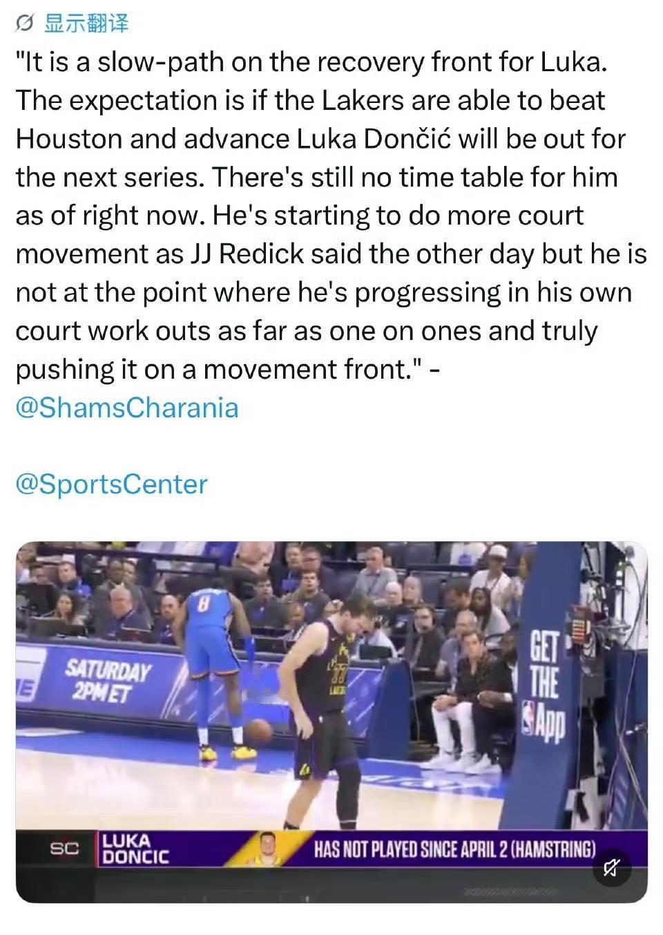 据知名记者Shams Charania消息,洛杉矶湖人队球星卢卡·东契奇的恢复进程依旧缓慢。消息人士透露,即便湖人本轮系列赛击败休斯顿火箭晋级,东契奇也预计将缺席次轮比赛。