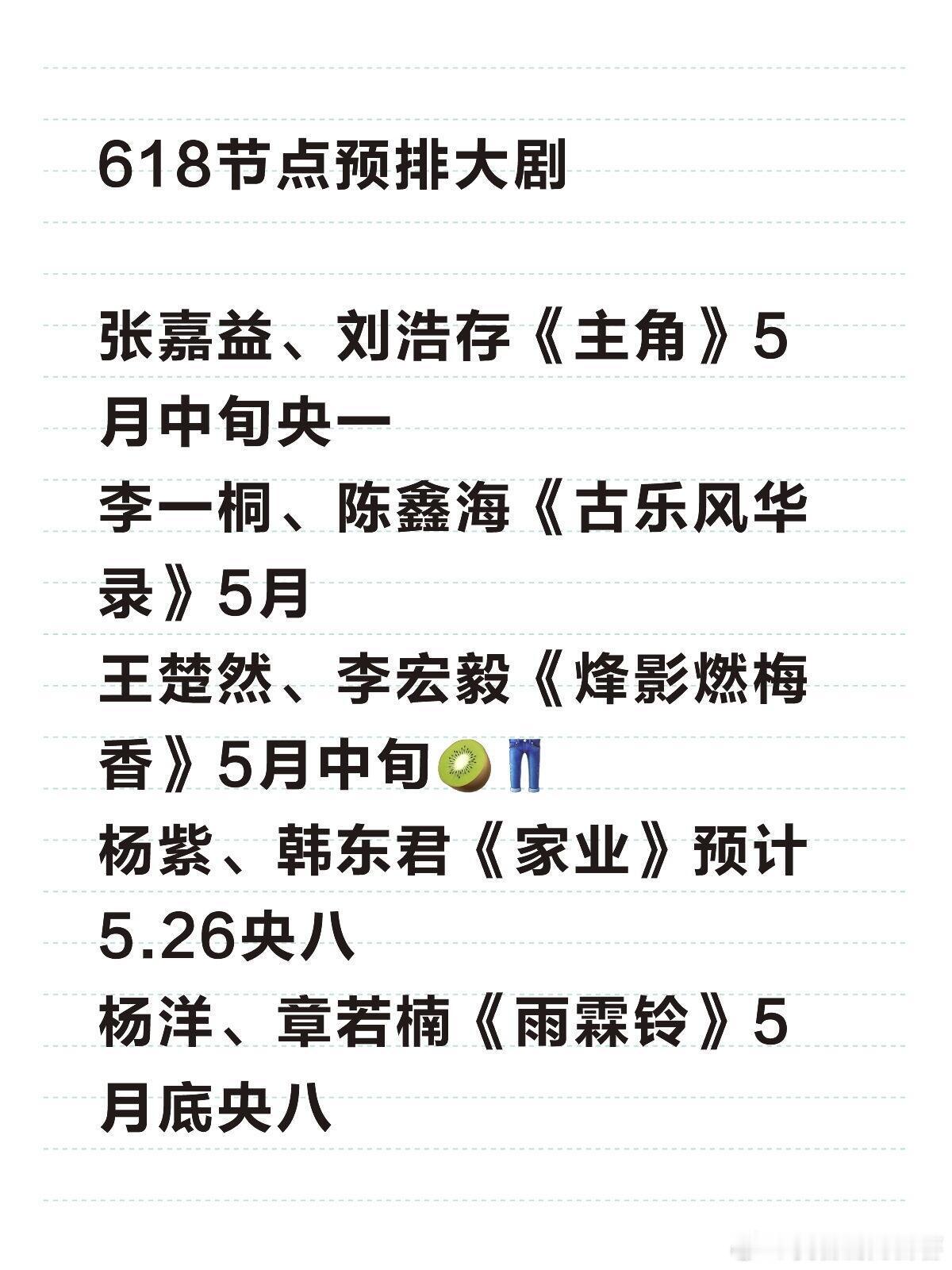 张嘉益、刘浩存《主角》5月中旬央一李一桐、陈鑫海《古乐风华录》5月王楚然、李宏毅《烽影燃梅香》5月中旬🥝👖杨紫、韩东君《家业》预计5.26央八杨洋、章若楠《雨霖铃》5月底央八张新成|丁禹兮《南部档案》5-6月(排名不分先后)白鹿、丞磊《莫离》预计6.8陈都灵|周翊然《翘楚》6月(排名不分先后)周柯宇|包上恩《炽夏》预计6.16(排名不分先后