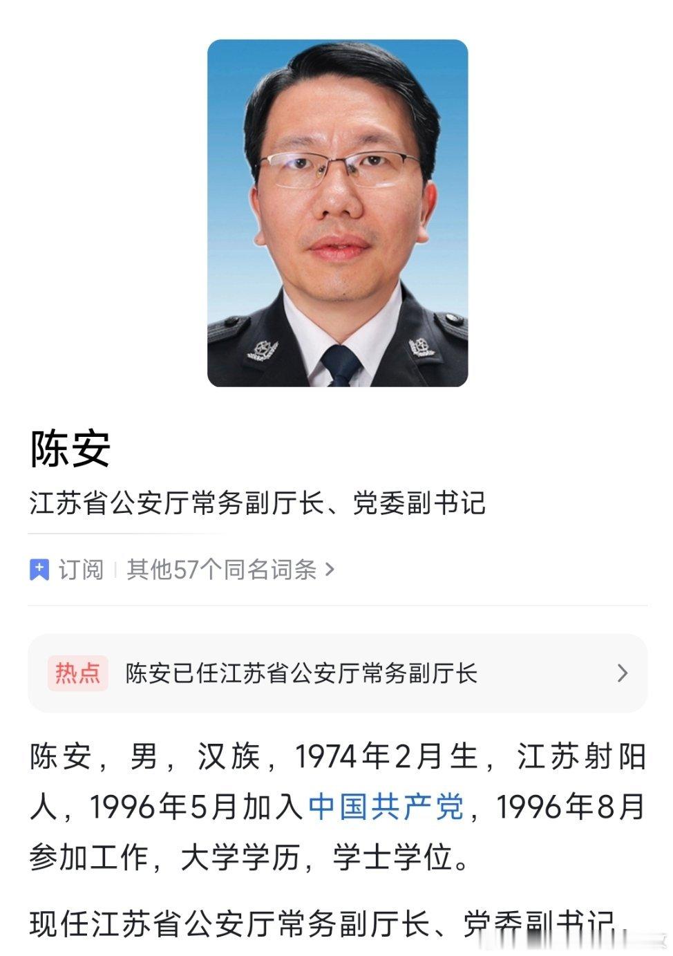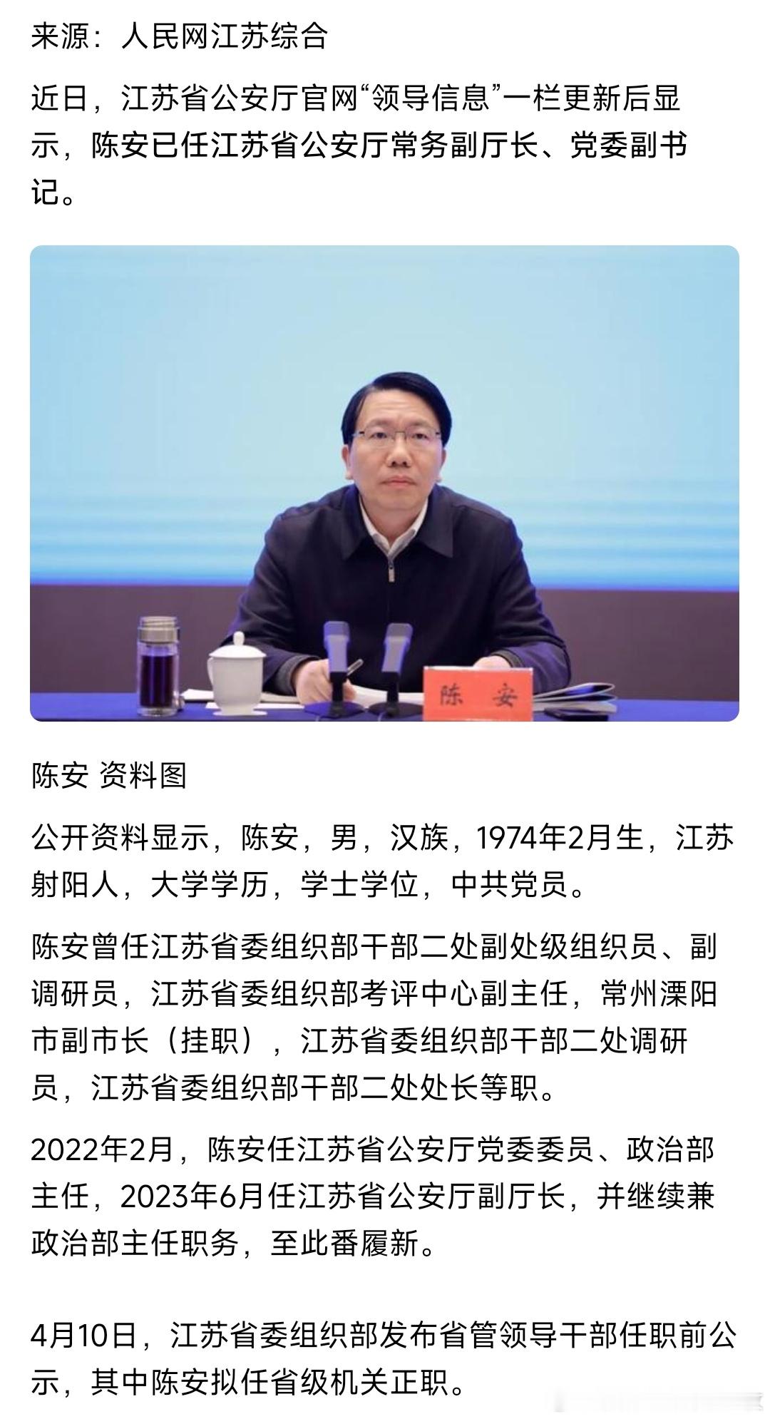 陈安已任江苏省公安厅常务副厅长、党委副书记。
