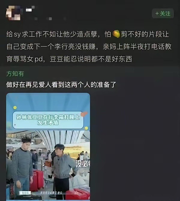 孙杨妈妈太强势了,网传她半夜打电话要求芒果台删除马頔的言论,马頔明明是开玩笑地说孙杨配不上张豆豆。孙杨否认妈妈联系节目组,孙杨太要面子了,经常当众指责妻子。表面上看,张豆豆物质条件上确实是高攀孙杨,可是孙杨优越感十足,总是要张豆豆哄着他来,这样男尊女卑的相处模式真的很累。网友说,他们可以预约一下再见爱人,有什么样的妈妈就有什么样的儿子,张豆豆太委屈了。