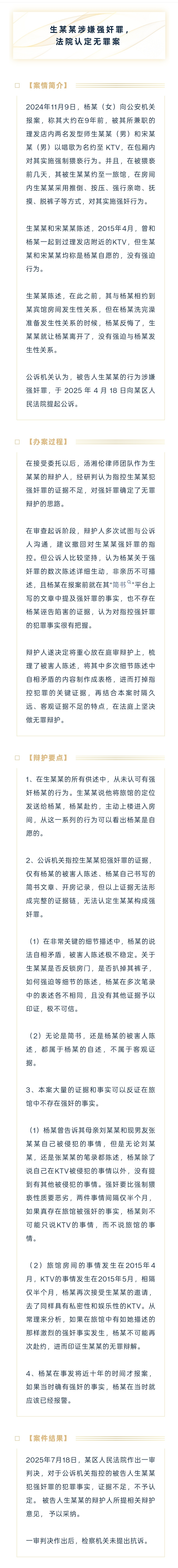2️⃣ 公诉机关指控男方犯强奸罪的证据,仅有女方陈述、在社媒发布的小作文以及开房记录,根本无法形成完整的证据链,也就无法认定生某某构成强奸罪。