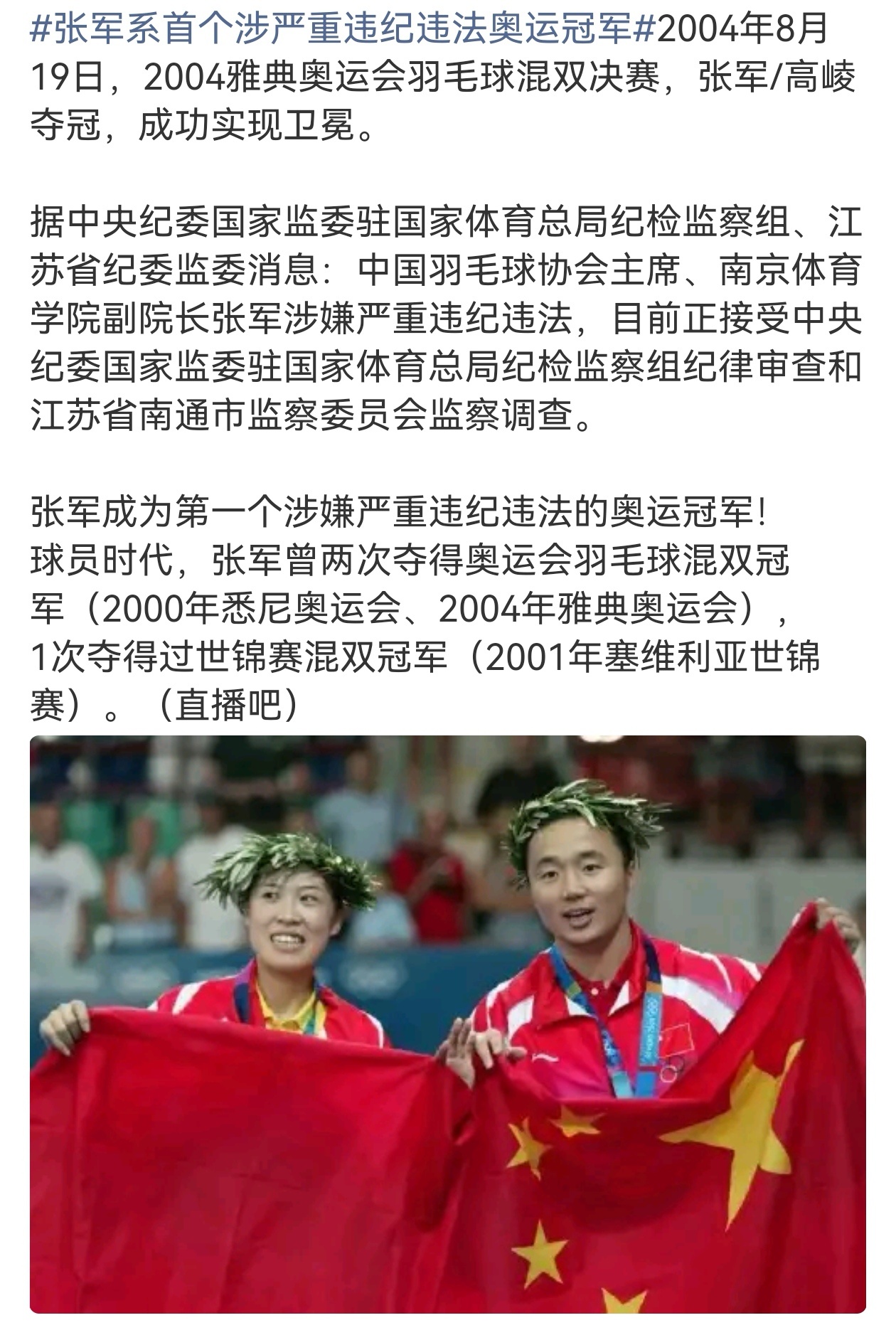4月29日,据官方通报,中国羽协主席、南京体育学院副院长张军,涉嫌严重违纪违法,接受纪检监察审查调查。随着张军官宣被查,他成为首位涉嫌严重违纪违法被调查的奥运冠军。张军与搭档高崚,曾斩获2000悉尼、2004雅典两届羽毛球混双奥运金牌,不仅夺得中国羽球首枚奥运混双金,更成为奥运混双首对卫冕组合。张军系首个涉严重违纪违法奥运冠军中国羽毛球协会主席张军被查