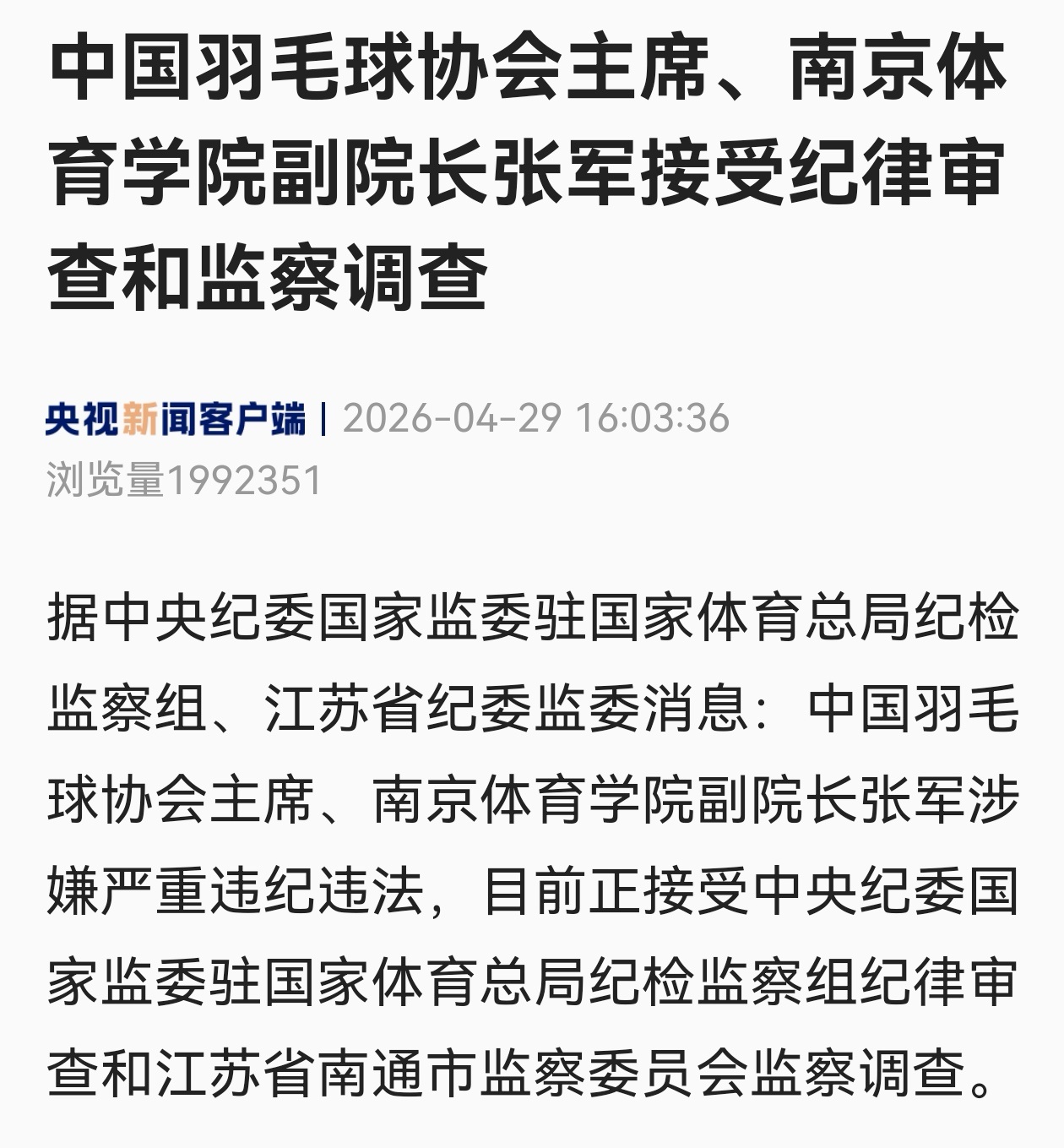 4月29日,据官方通报,中国羽协主席、南京体育学院副院长张军,涉嫌严重违纪违法,