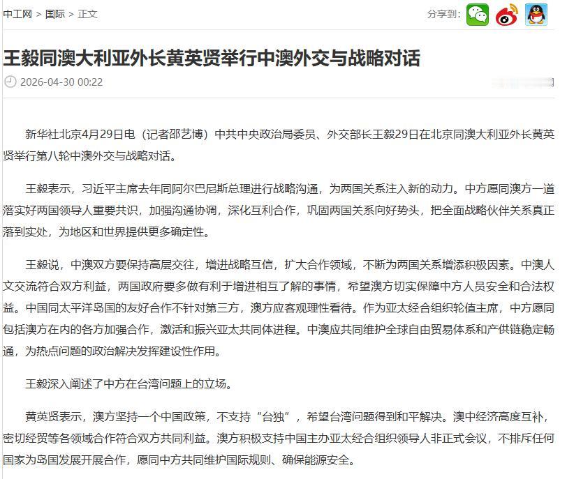 但无论如何,在台湾问题上,澳大利亚这次的表态是明确的、坚定的。黄英贤在北京明确表示,澳方致力于发展对华关系,愿同中方坦诚沟通、增进了解、加强合作、妥处分歧。这话说得比在东京时实在多了。在东京,澳大利亚谈的是“确保霍尔木兹海峡航运安全”;在北京,澳大利亚谈的是“愿同中方共同维护国际规则、确保能源安全”。