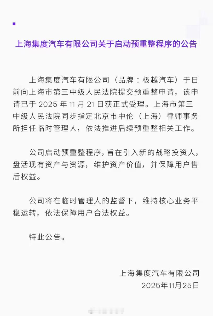 极越汽车正式进入司法重整 极越汽车要整合这是打赢“复活赛”了