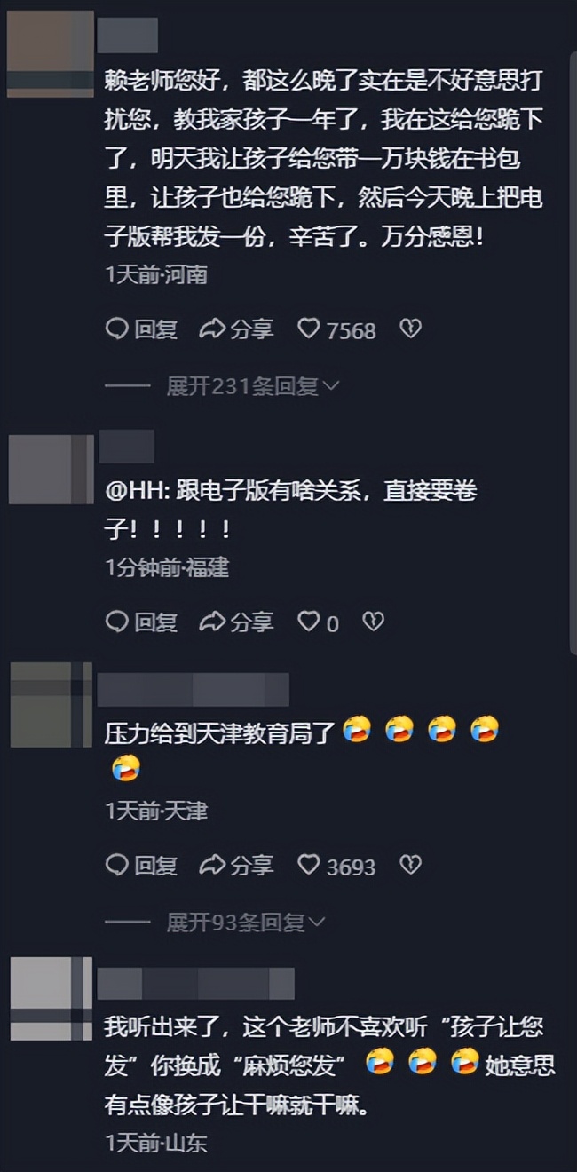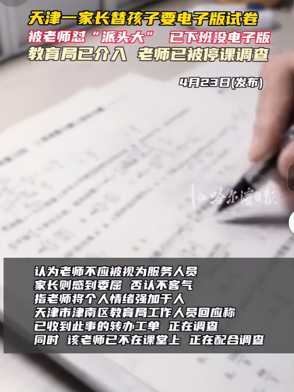 事情的起因是,天津一个学生家长在听到自己家孩子,白天没有发到试卷,自己去找老师,发现老师已经下班了,只好回家让妈妈问问是不是能找到电子版,这样可以复印。