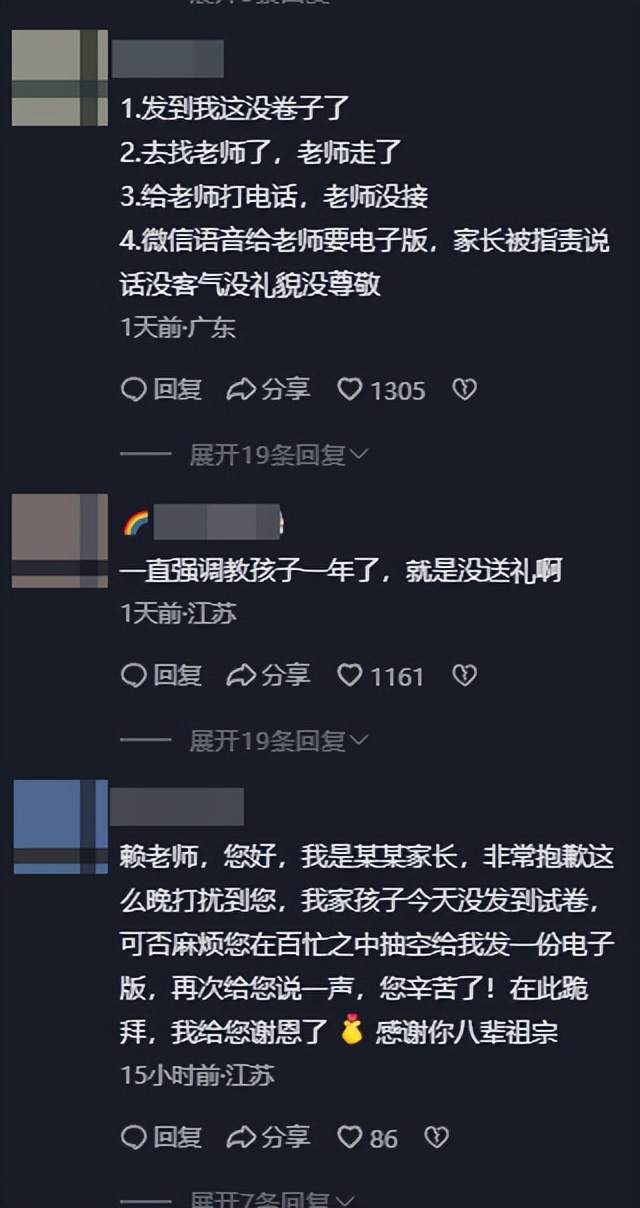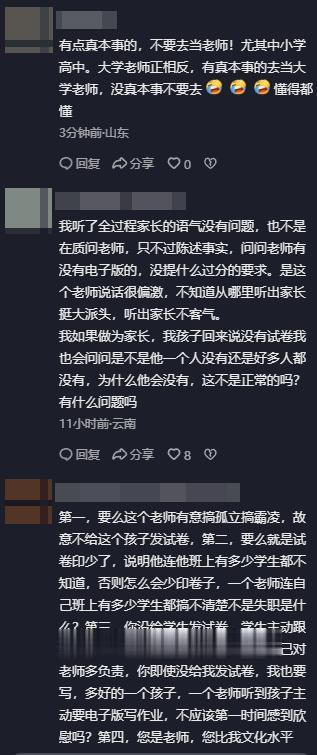 老师则违背师德,将负面情绪转嫁家长,还回避试卷发放不到位的工作疏漏,作为班主任,即便无电子版,也应耐心解释而非指责。