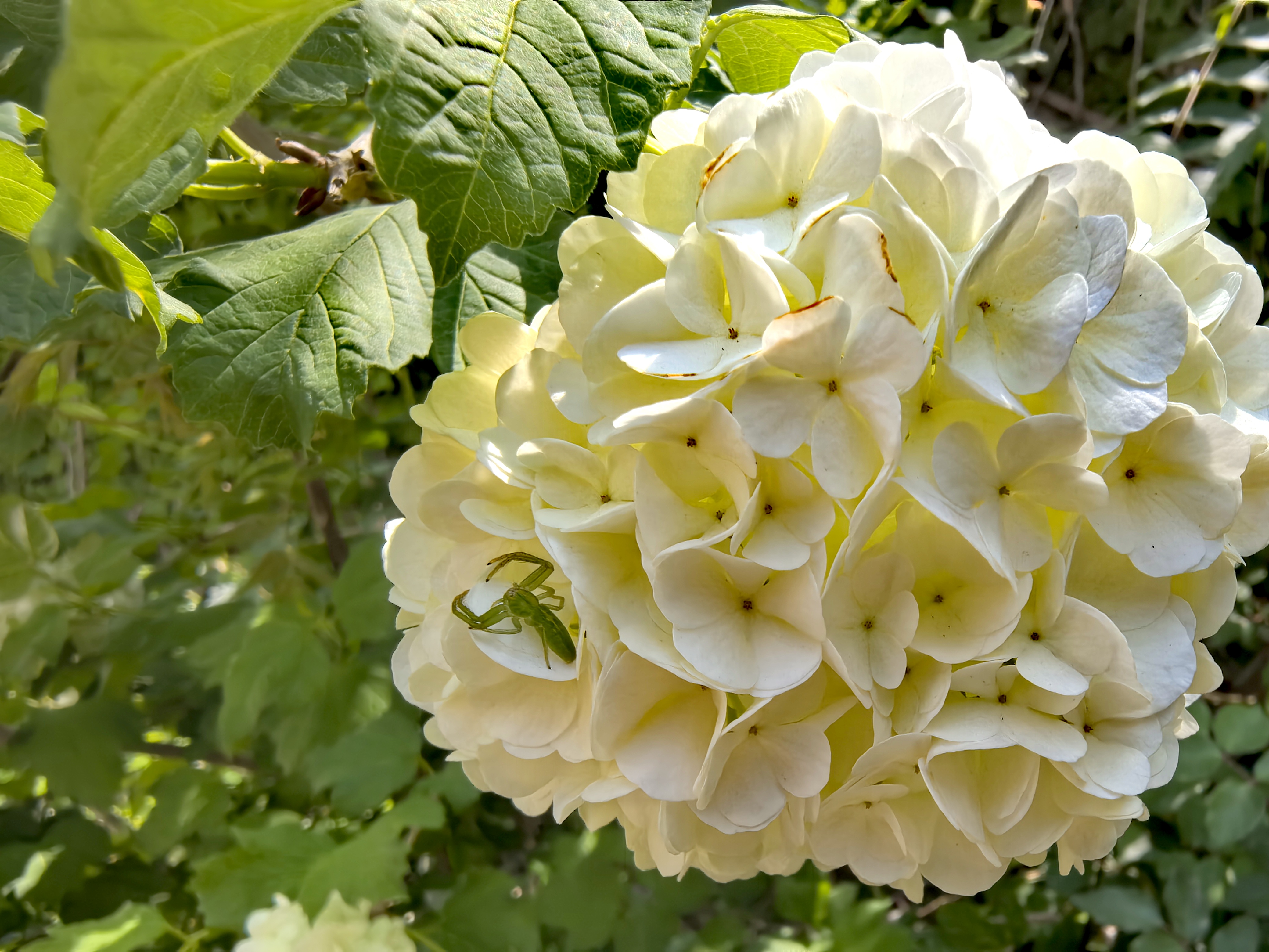 心绪的转捩,是在那一片绣球花前。那是一种迥异的气韵。牡丹是独唱的旦角,它们却是静静的一阕和声。累累的、瓷白的花球,团团簇拥着,像是尚未化开的雪,又像是孩童用最干净的云絮捏成的梦。阳光透过枝叶的间隙,软软地敷在上面,那白便不是呆板的了,晕着一层极淡的、毛茸茸的光,温柔地呼吸着。这里没有逼人的华彩,只有一片凉沁沁的、静到极处的安逸。正对着这片出神的洁白发呆,目光偶然垂落,便看见了它——那位小小的、不速的客。