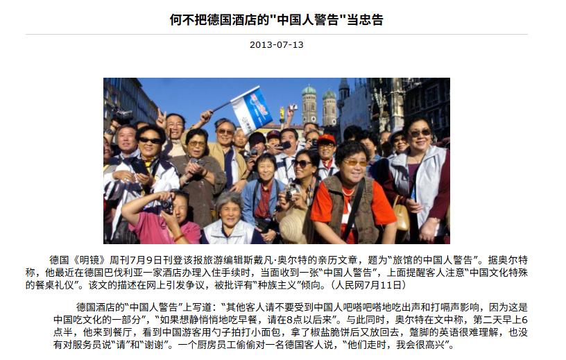 中国经济网 2013-07-12——何不把德国酒店的"中国人警告"当忠告