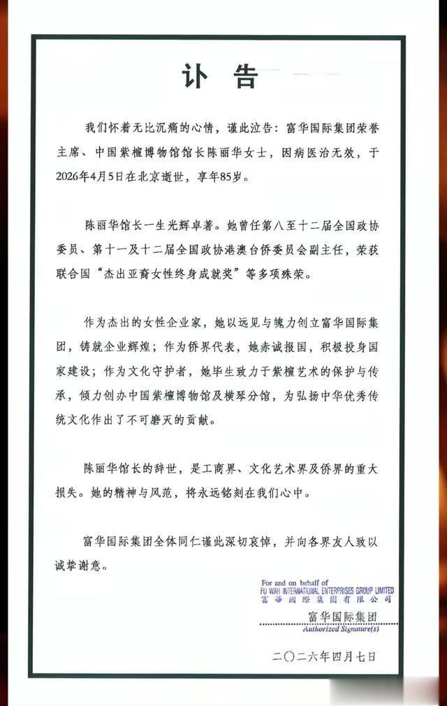 2026年4月7日,富华国际集团发布讣告称,富华国际集团荣誉主席、中国紫檀博物馆馆长陈丽华女士于4月5日在北京因病去世,享年85岁。