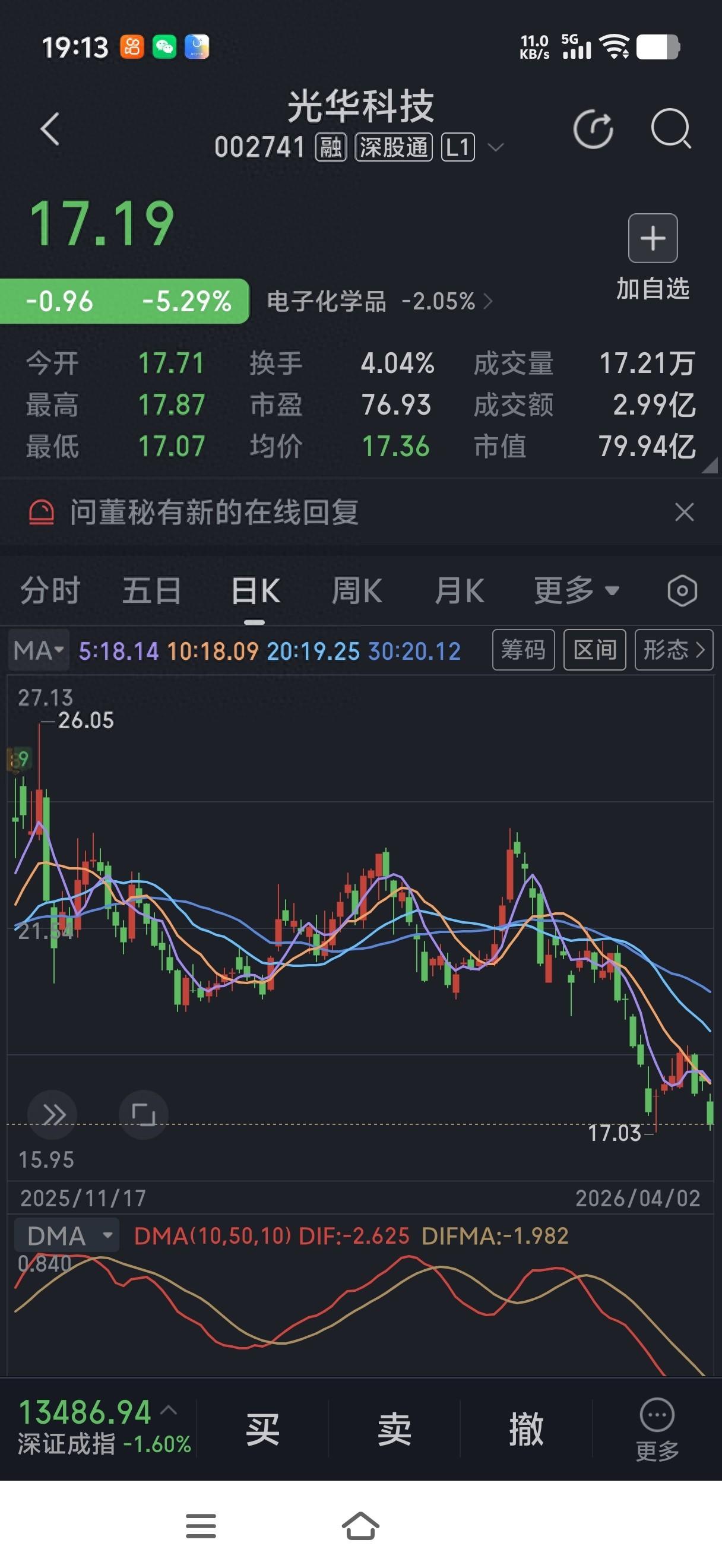 乔某看着自己的账户,心中无比难受。最终再三考虑后,还是在今天以17.10的价格割肉卖出。