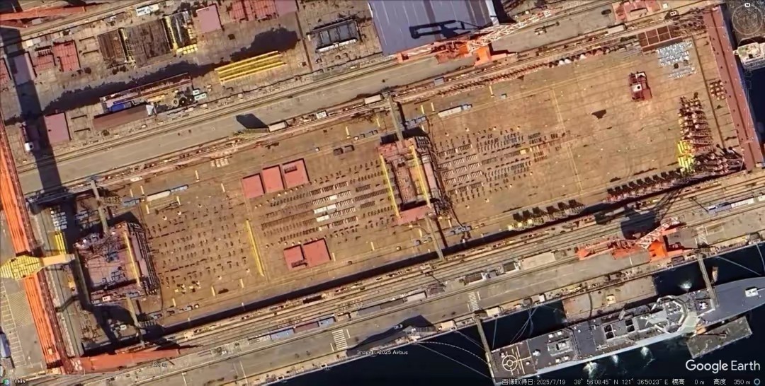 如果说宣传片里的谐音彩蛋,还属于官方的含蓄暗示,那此前大连造船厂传出的高清卫星图像,就为第四艘航母的核动力属性,提供了实打实的实物证据。