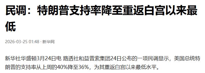 路透社和益普索3月24日的民调显示,特朗普支持率从40%跌到36%——重返白宫以来的最低水平。
