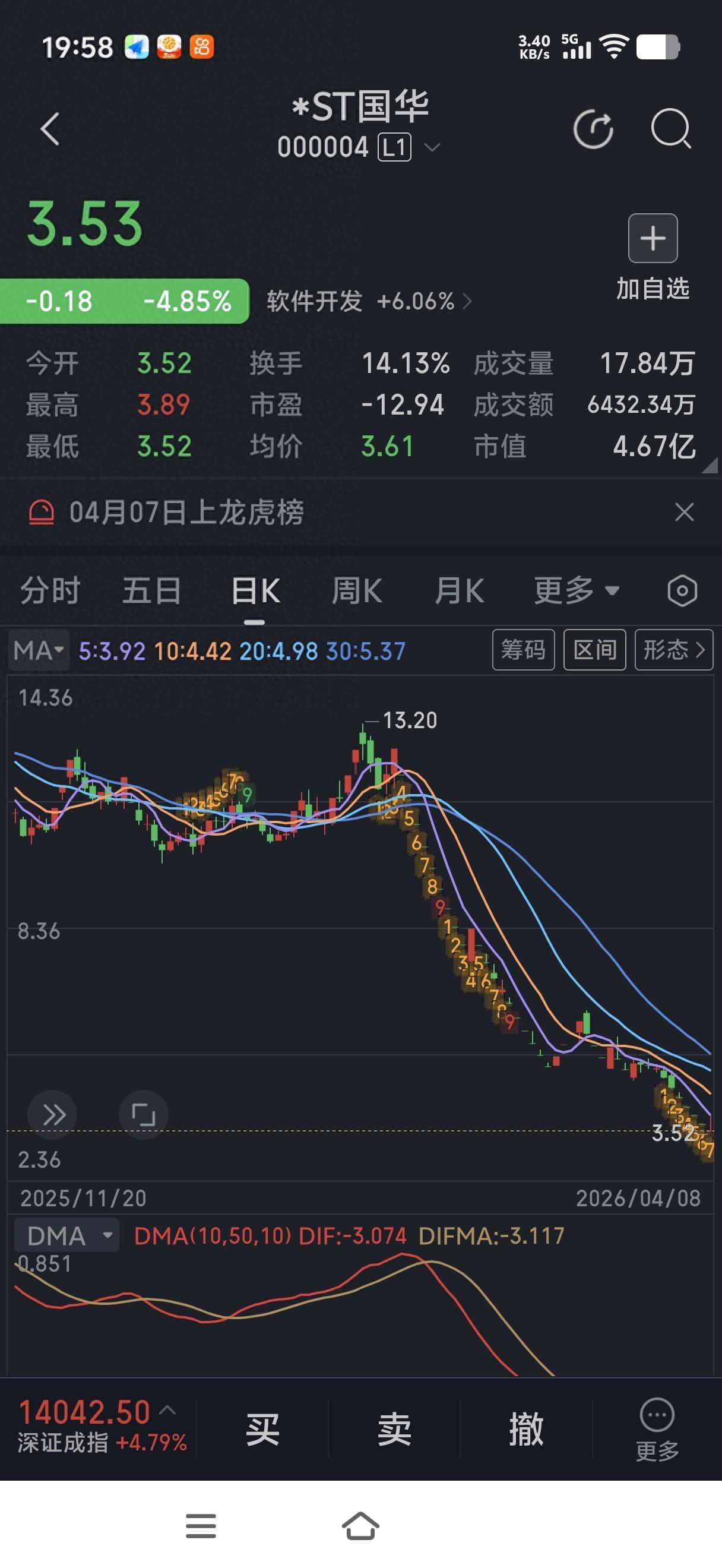 2026年2月13日当史某打开自己的手机自选股后,突然眼前一亮。发现 *ST 国华这支股票在9个一字跌停后,突然打开跌停一路直奔涨停板上冲,他认为自己翻身的机会来了。于是他在慌乱中以8.3元的价格买入50000股。当这只股票涨停后,又害怕自己挂单失败而错过上涨的机会。当他再三确认自己的账户已经买入成功后,才松了一口气,心想这一次肯定能连抓几个涨停板。结果让他做梦都不会想到,买后第二天这只股票就连续10个跌停,史某一看整个人都傻了。由于这一次他押的是自己仅剩的全部筹码,又跌了这么多,也只能拼命死扛。结果这只股票又在连续5个跌停后今天股价报收于3.53。