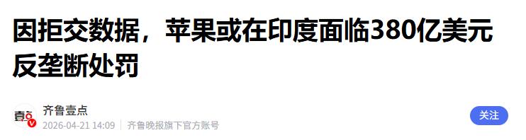 齐鲁壹点 2026-04-21——因拒交数据,苹果或在印度面临380亿美元反垄断处罚