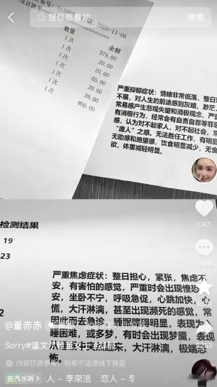 2025年11月,董赤赤在最后一个视频里自爆患上了严重的抑郁症,当时还晒出医院的检查报告。
