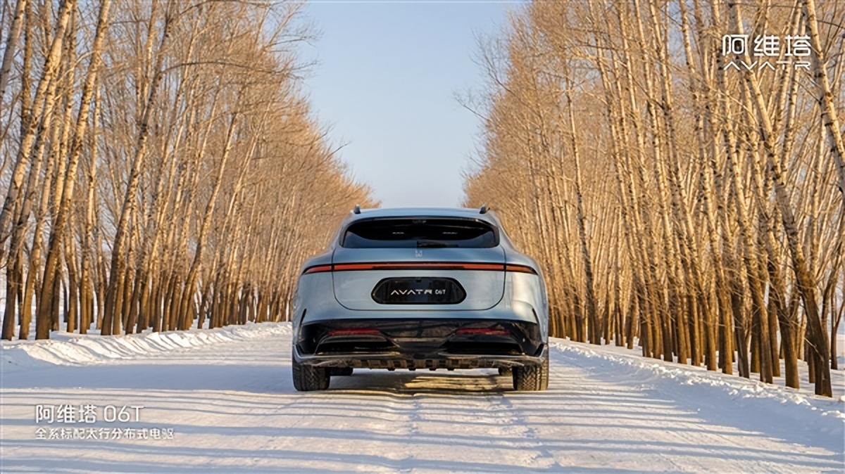 阿维塔06T汽车 :银灰色阿维塔06T尾部视角在雪地林间道路