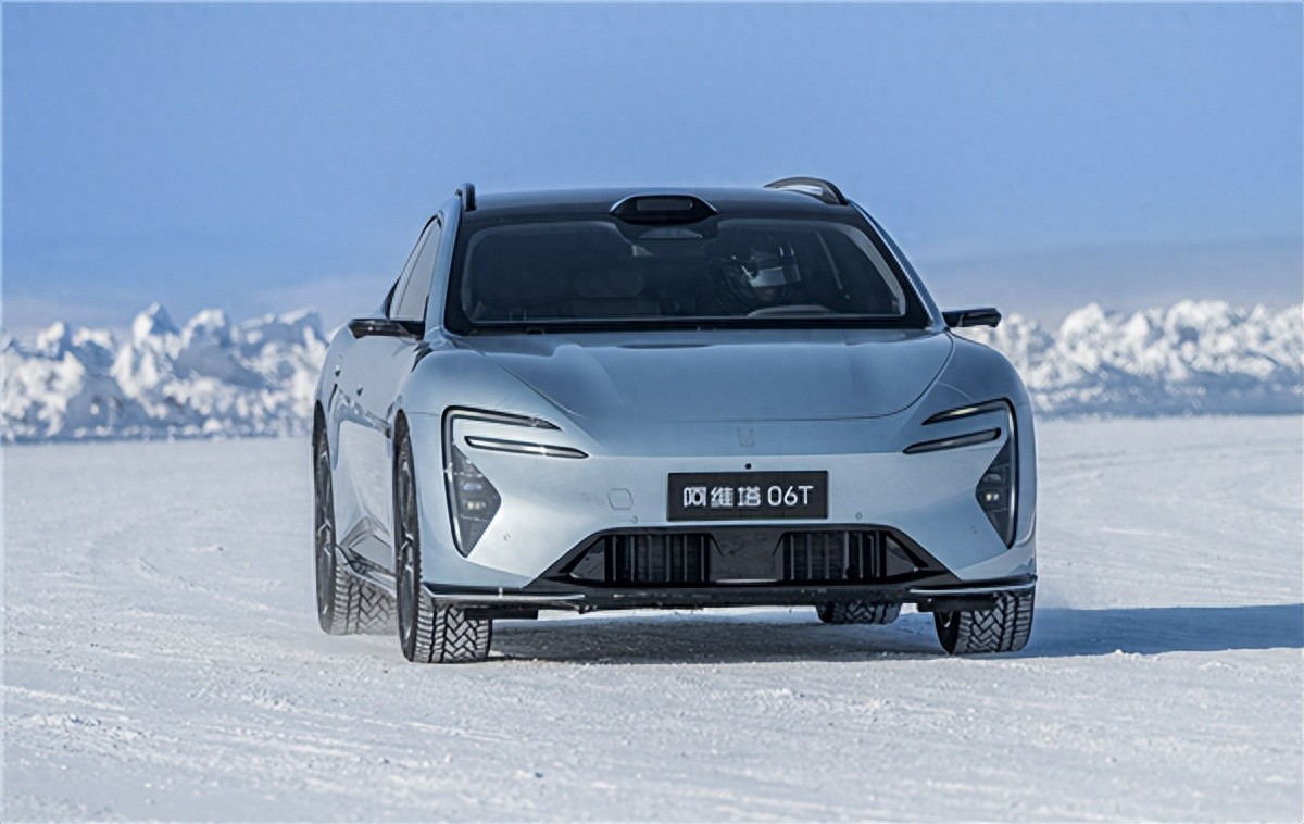 阿维塔06T汽车 :银灰色阿维塔06T在雪地路面行驶