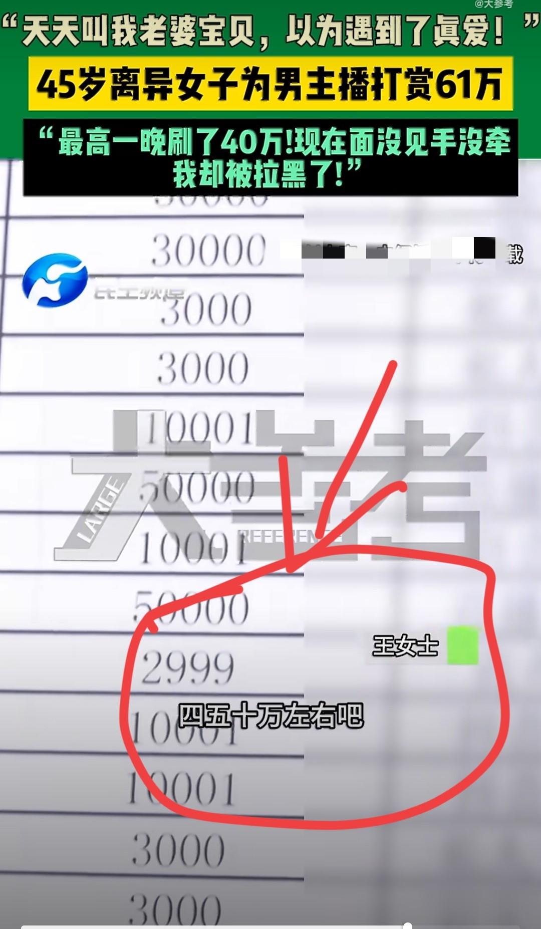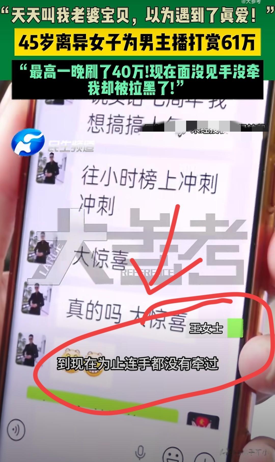 王女士断断续续为男主播打赏了61万,王女士觉得自己也表达了足够的诚意了,也觉得自己能给他幸福,所以王女士提出了想要奔现要求。