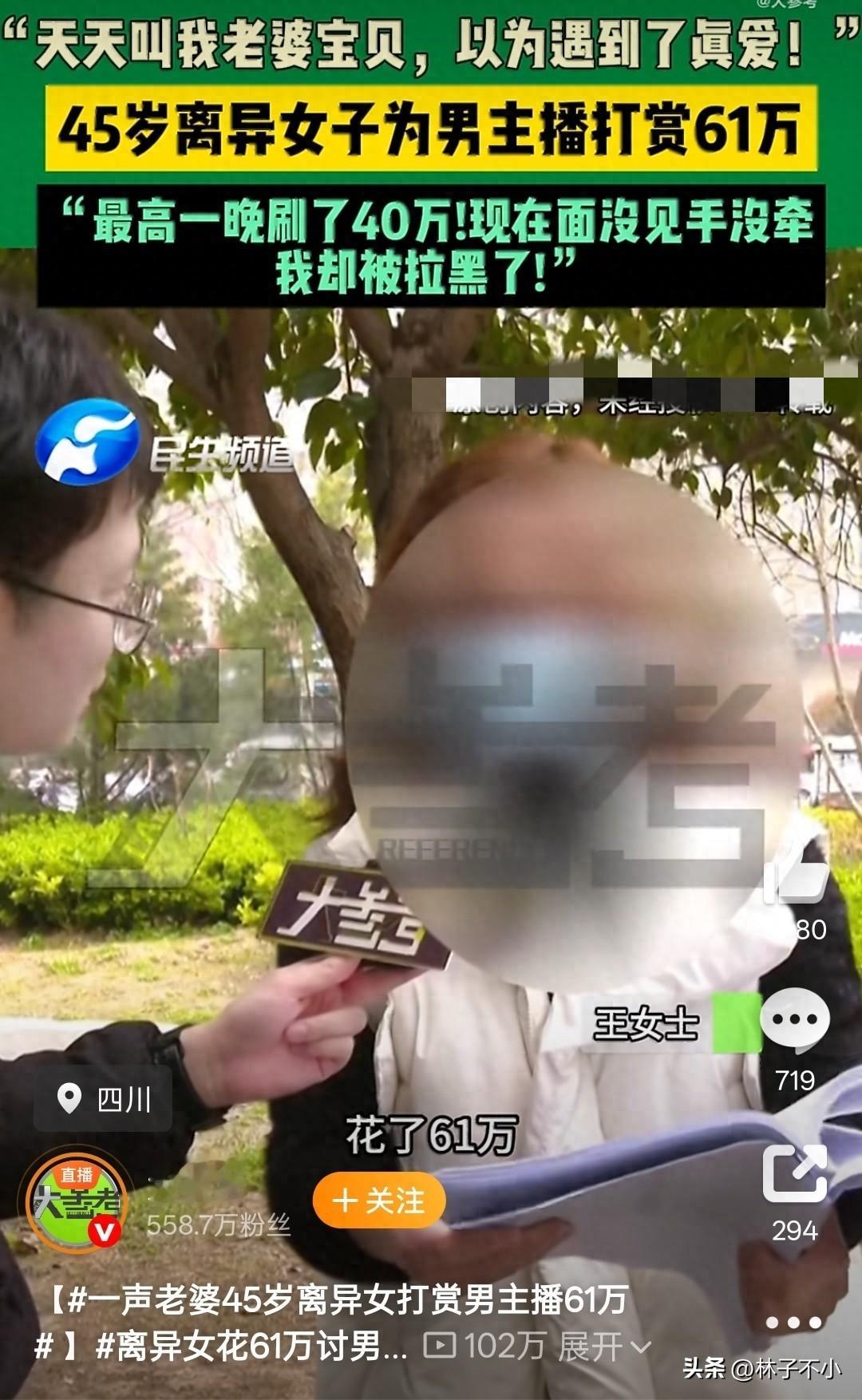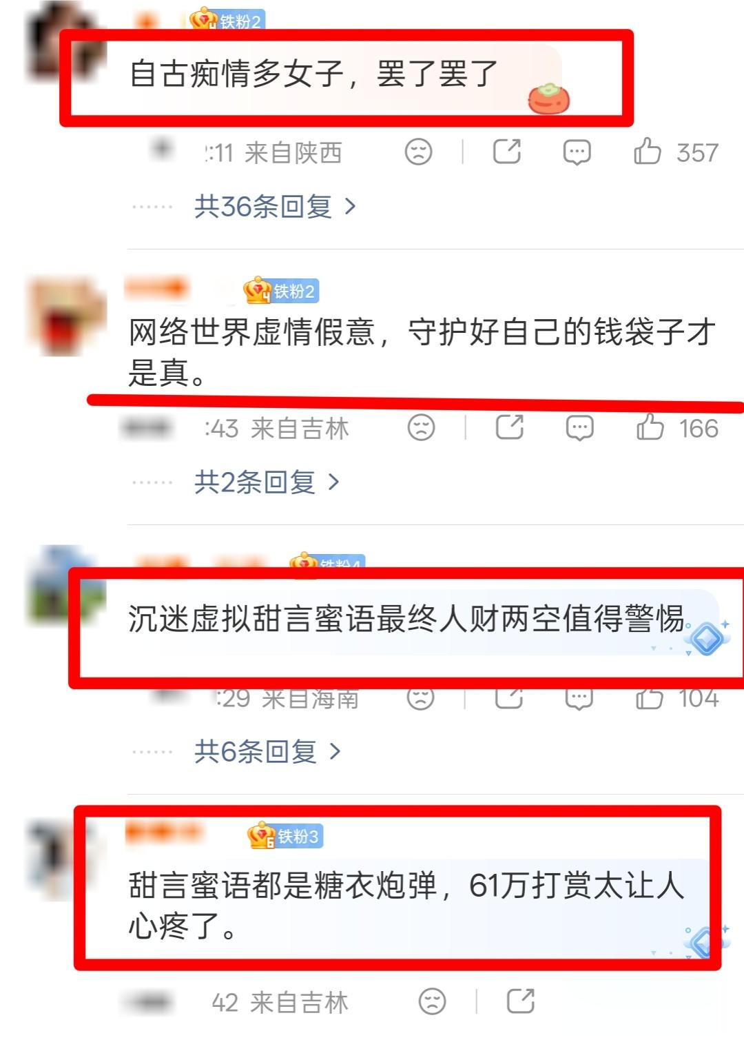 有网友可怜王女士的遭遇,网友觉得甜言蜜语都是糖衣炮弹,61万打赏太让人心疼。
