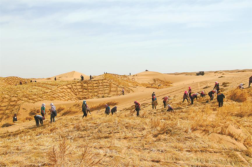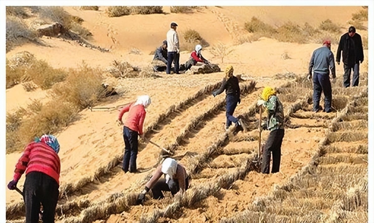 三北工程进入中期以后,科学家们发明了“麦草、稻草在沙面扎草方格”的土办法:每个格子像天然防风墙一样,能把风速大幅压低,使沙子固在格子里动不了,还能把雨水留住。