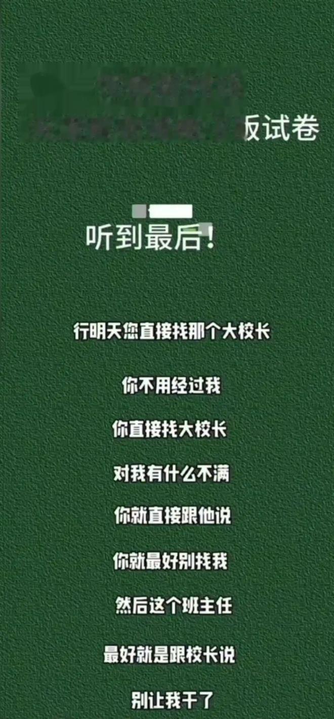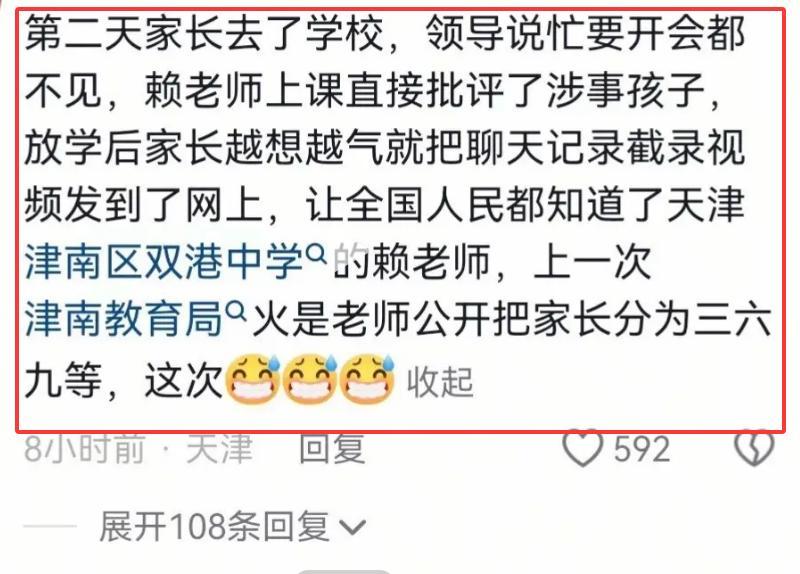 二、噩耗之二:家长找校领导被“开会”打发,老师次日课堂公开批评学生如果说往届生的爆料毁掉的是赖老师的“历史形象”,那么接下来的这条内幕,则直接击穿了公众对学校和老师容忍的底线。