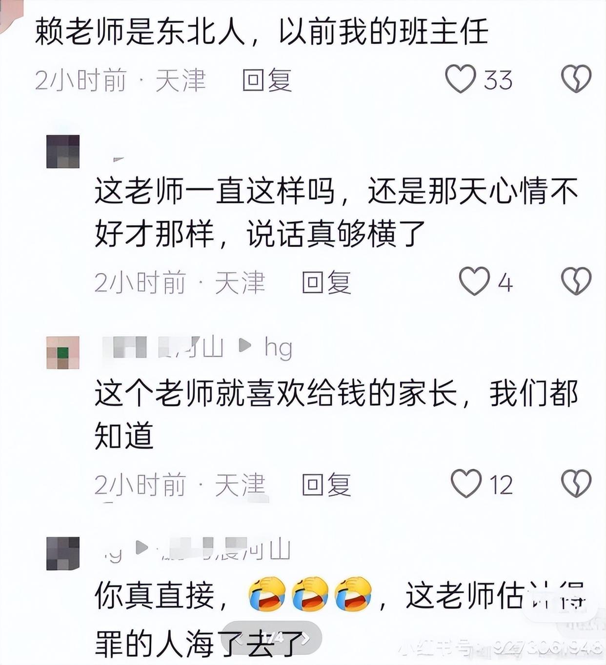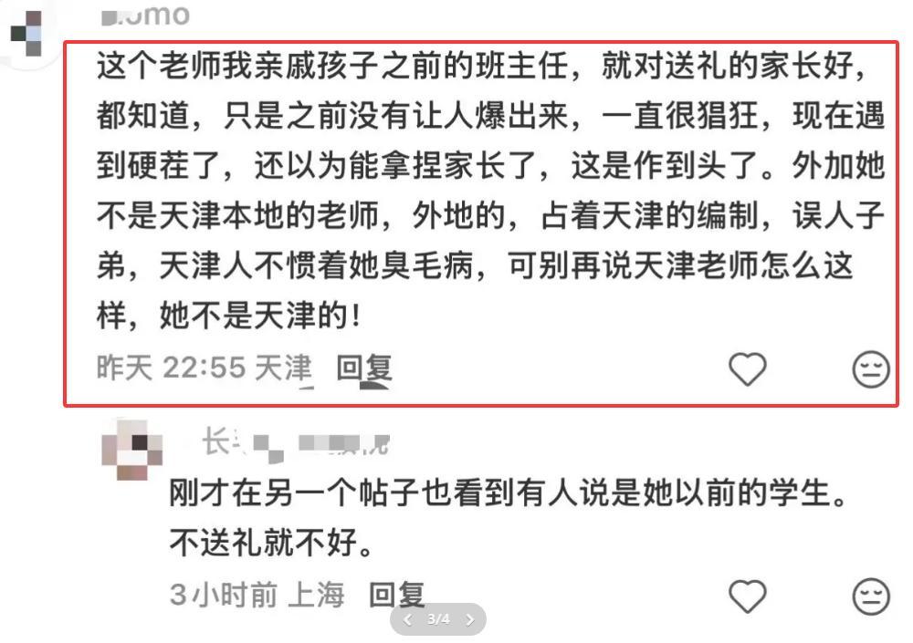 紧接着,一位IP地址显示天津的网友也站了出来,直言不讳:“赖老师是我以前的班主任,她最喜欢的就是那些会‘表示’的家长。给钱给物的,她记一辈子;不给的,她也能记一辈子,记仇。”