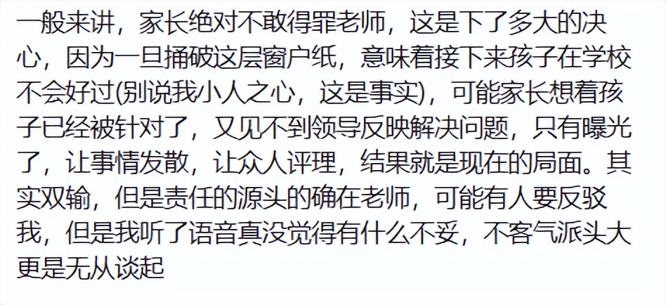 这话说得太对了。在中国的人情社会里,家长对老师的态度往往是“宁可自己受委屈,绝不敢得罪老师”。能让一个家长豁出去、不惜撕破脸也要讨个公道的,绝不是一次小小的语气误会,而是积压已久的愤怒和绝望。