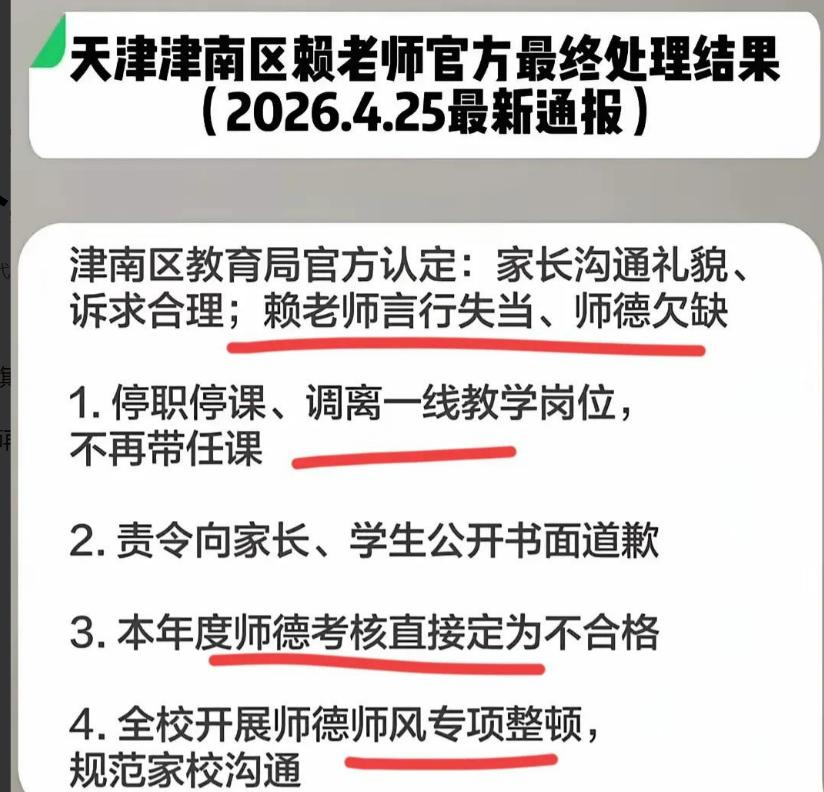 官方认定:赖老师在沟通中存在 “言行失当、职业素养不足” 的问题,并作出三项处理——