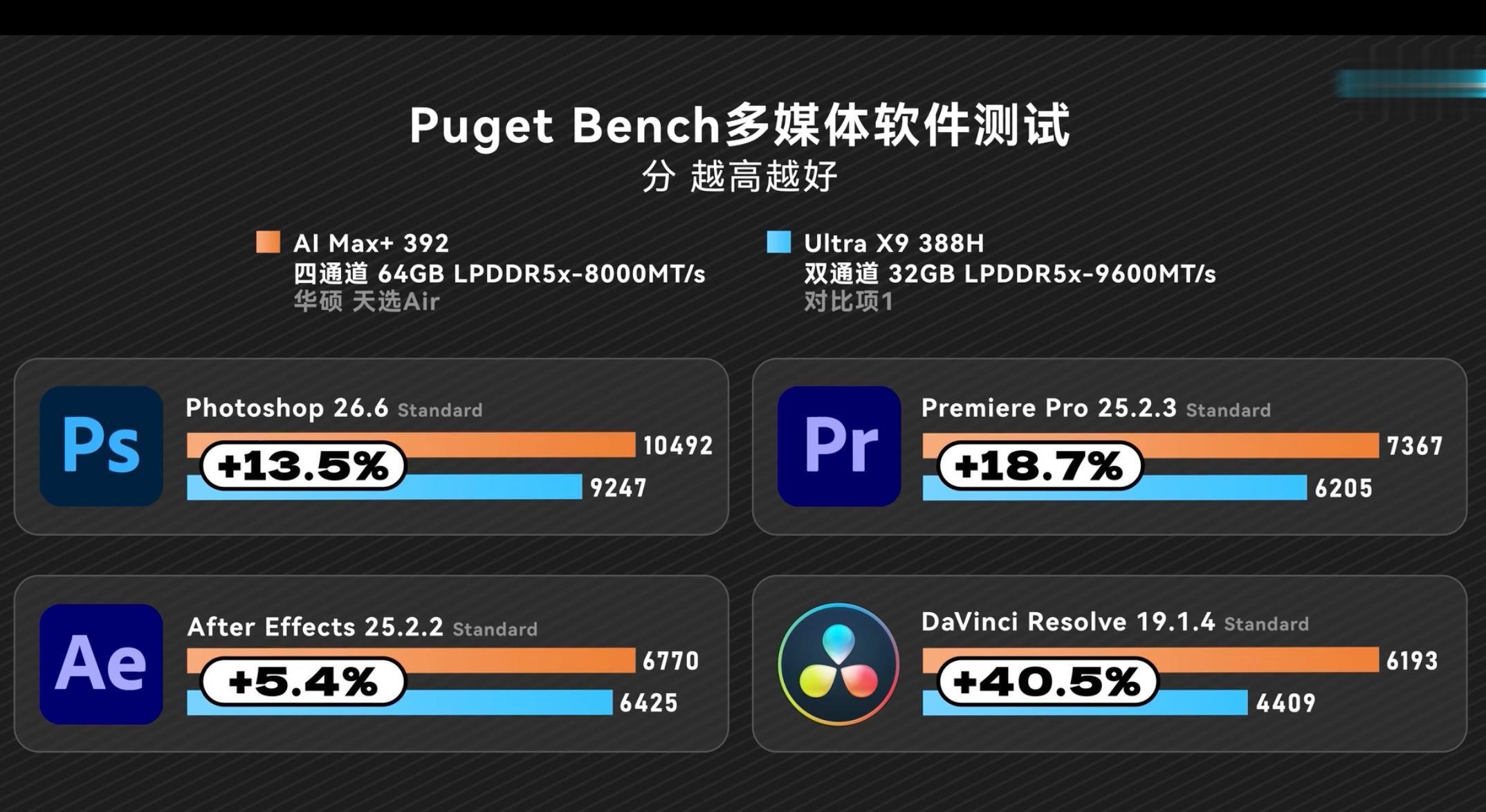 生产力场景各有所长。AMD凭借全大核与多线程优势,在Ps、Pr、Ae、达芬奇等等场景都是领先,统一内存对创作类软件友好,大模型本地部署更流畅。Intel胜在软件生态成熟,Office、编程等基础办公适配性拉满,单核响应轻快,适合纯文档、轻编程需求,但多线程生产力明显吃亏。