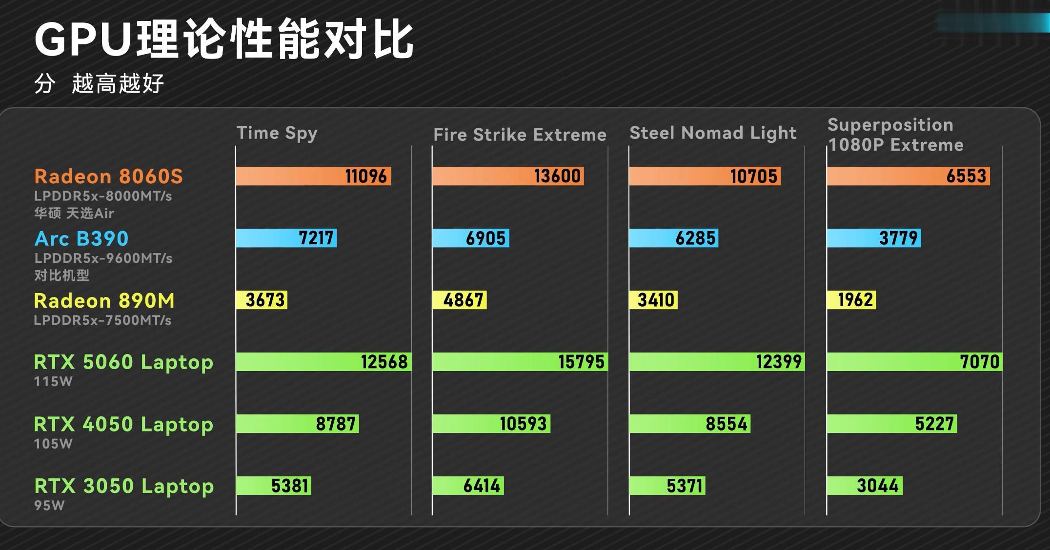 GPU方面,Radeon 8060S综合领先74%于ArcB390,完全不是一个重量级的选手,与入门独显RTX4050相比,Arc要落后27%,而8060S则是领先26%。