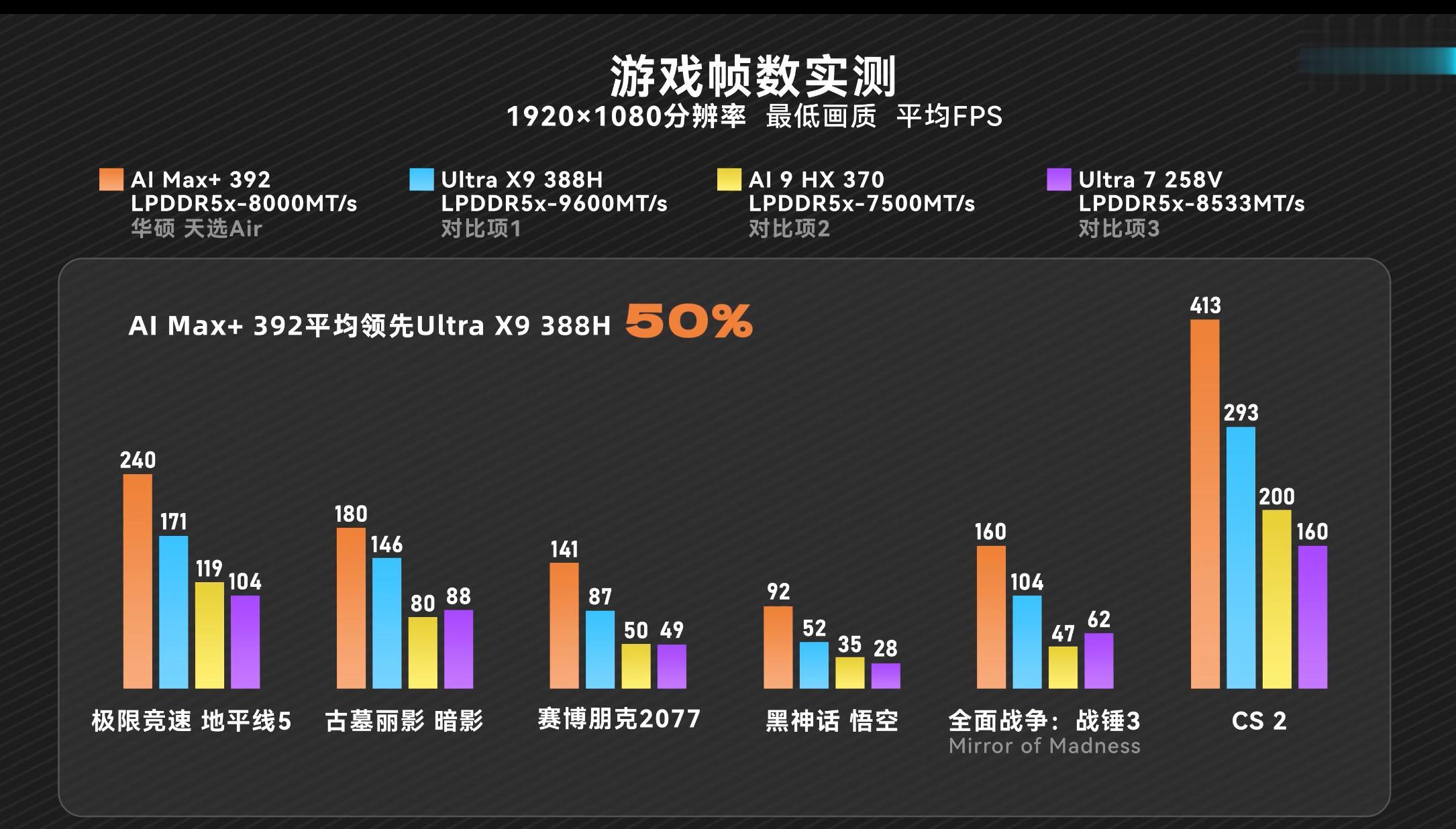 游戏体验是二者差距最明显的环节。AMD 40CU大集显规模优势拉满,1080P下《CS2》等网游帧率大幅领先,即便《黑神话:悟空》《赛博朋克2077》《地平线5》等3A大作,也能稳定百帧左右甚至240帧,媲美入门独显。实测数据显示,锐龙AI Max+ 392游戏性能领先Intel同代旗舰约50%,大集显战力碾压级优势。Intel依托XeSS帧生成技术优化流畅度,但受限于集显规模,高负载3A表现仍难追AMD。