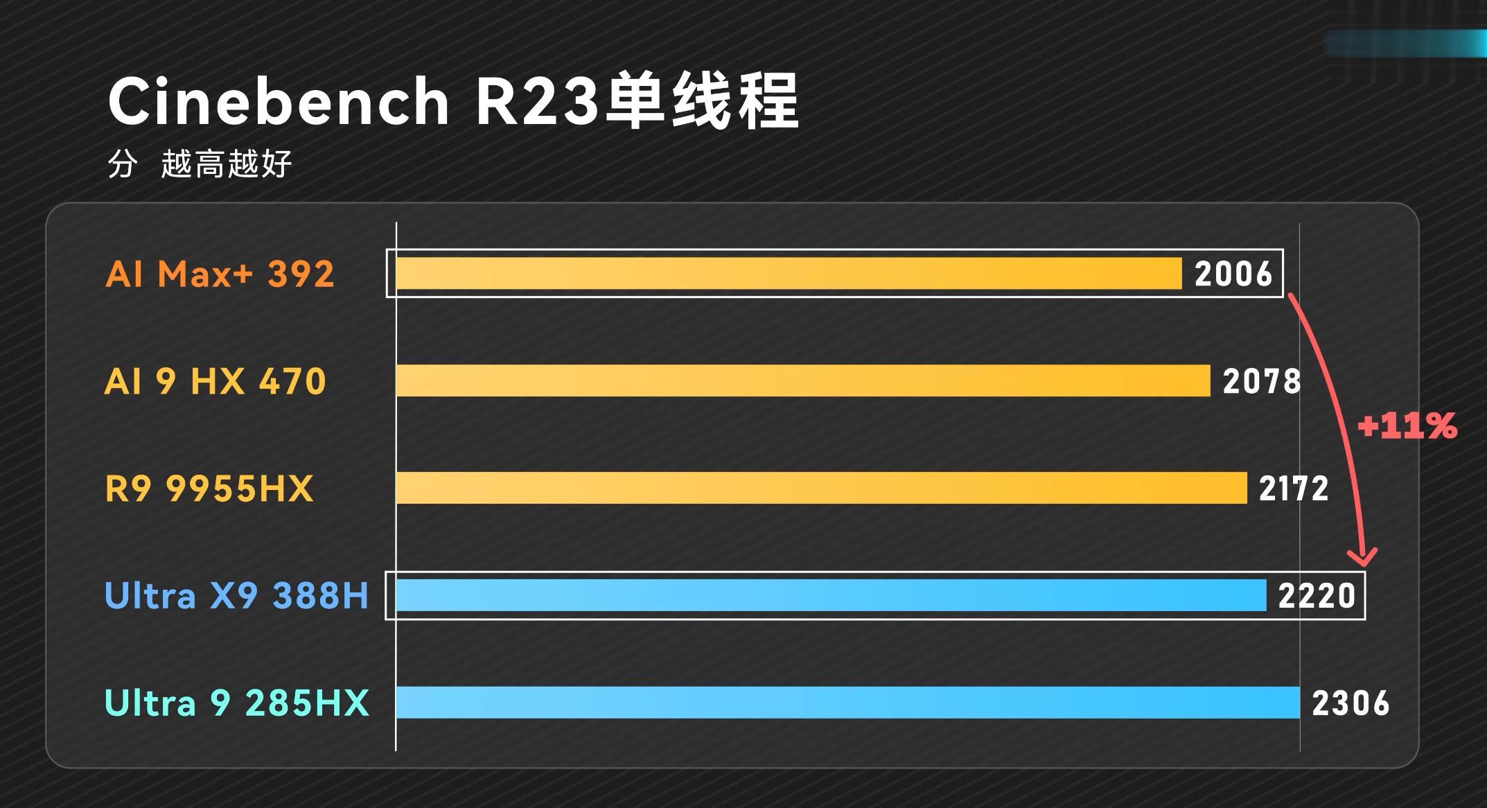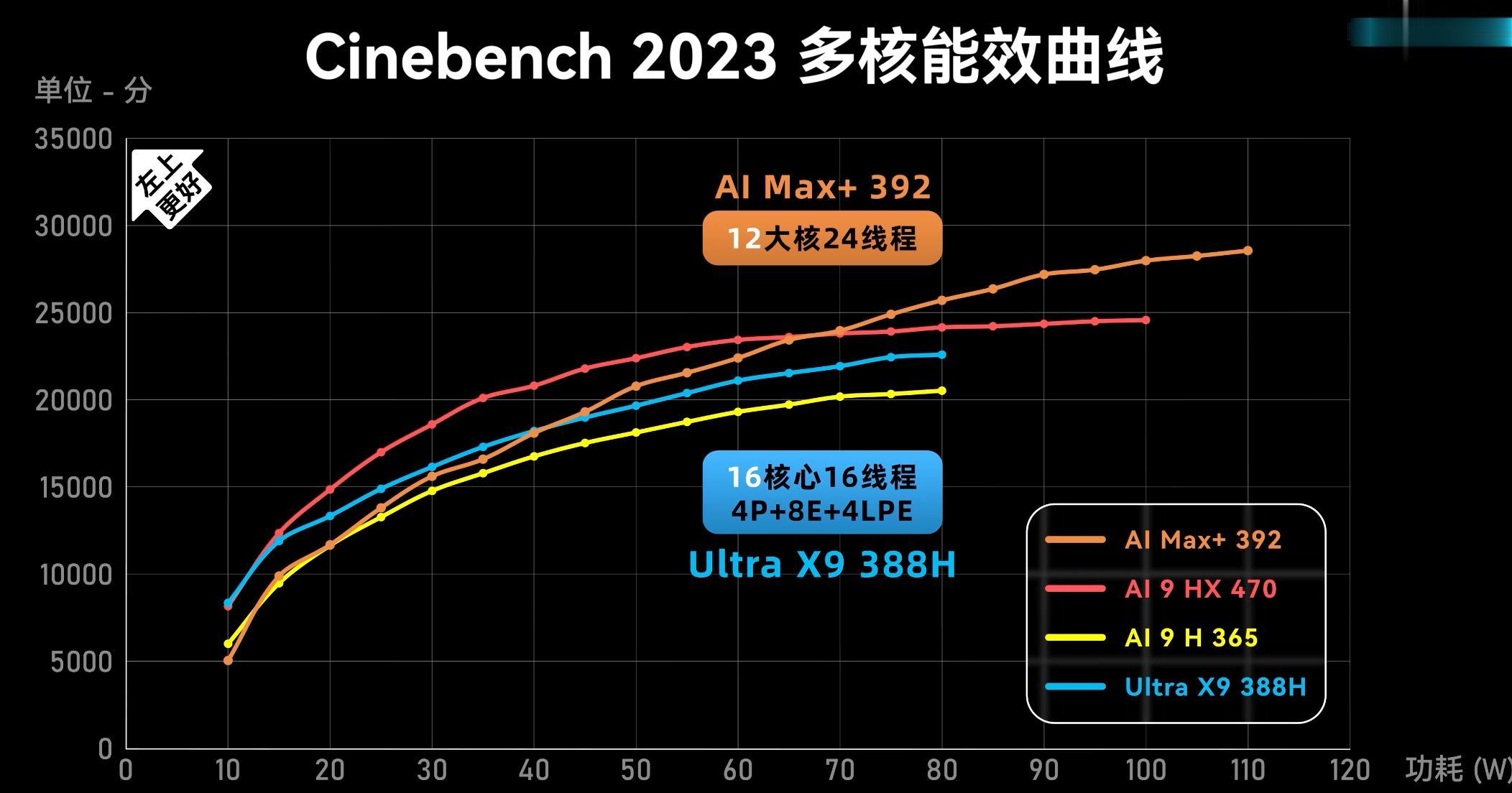 根据笔吧实测,CPU性能方面,Ultra X9 388H单线程领先于AMD锐龙AI Max+ 392 有11%,多核性能的情况就不一样了,40W功耗是一个分界线,40W以后都是AI Max+ 392的性能领先,在80W性能时则已经达到Ultra X9 388H性能极限,而AI Max+ 392还能跑到110W,明显看出AMD的极限性能更强。