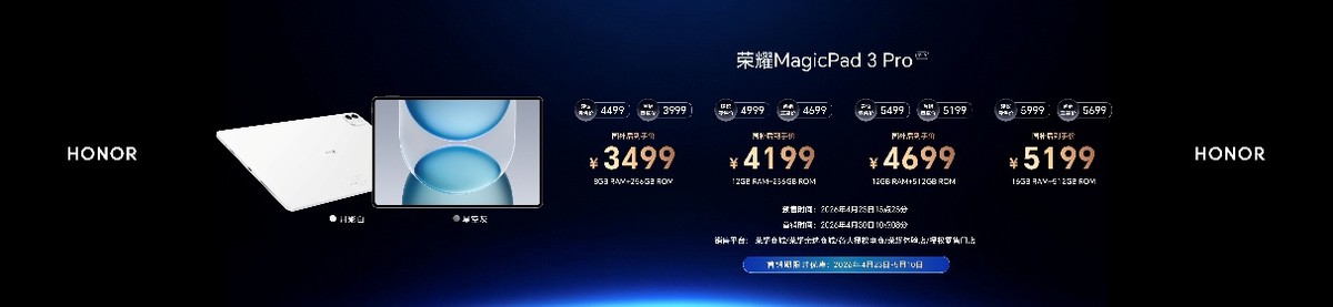 荣耀MagicPad3 Pro 12.3现已在荣耀商城、授权电商平台、荣耀体验店、授权零售门店等官方销售渠道开售,4月23日至5月17日期间,购买荣耀MagicPad3 Pro 12.3限时赠送价值499元原装智能键盘、学⽣认证送价值399元荣耀Magic-Pencil 4s手写笔;4月23日至5月10日期间,享6期免息分期;4月23日至5月31日期间,99元购价值238元2年碎屏宝、以旧换新补贴额外补贴100元,组合购原装智能触控键盘和荣耀Magic-Pencil 3触控笔⾄⾼优惠300元等福利权益。所有福利,数量有限,先到先得。荣耀MagicPad3 Pro 12.3国补优惠价3499元起。