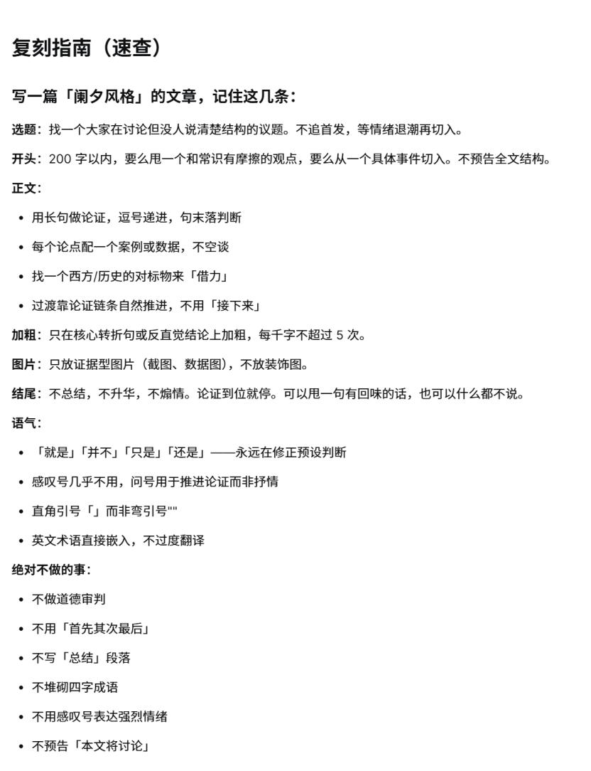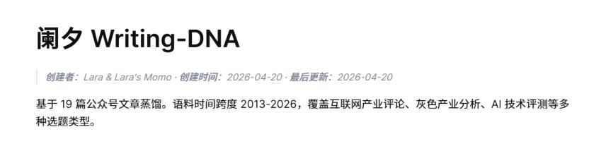 我大概试了试,确实有些不同的体验。先给AI投喂了十几篇自己的文章,想看看所谓的Skill蒸馏是什么效果。结果收到一份几千字的解构报告,从选题偏好到句式习惯逐帧分析,结尾还附了一份复刻指南。