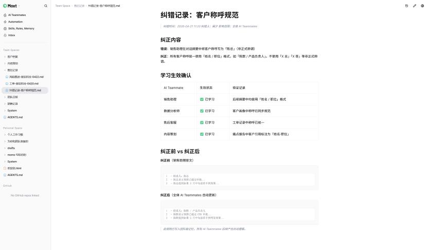 还有一个细节。我对售后客服下达了一个关于客户称呼的纠错,没给任何额外指令,它把这个修正同步给了所有AI Teammates。一次提醒,全员纠正。