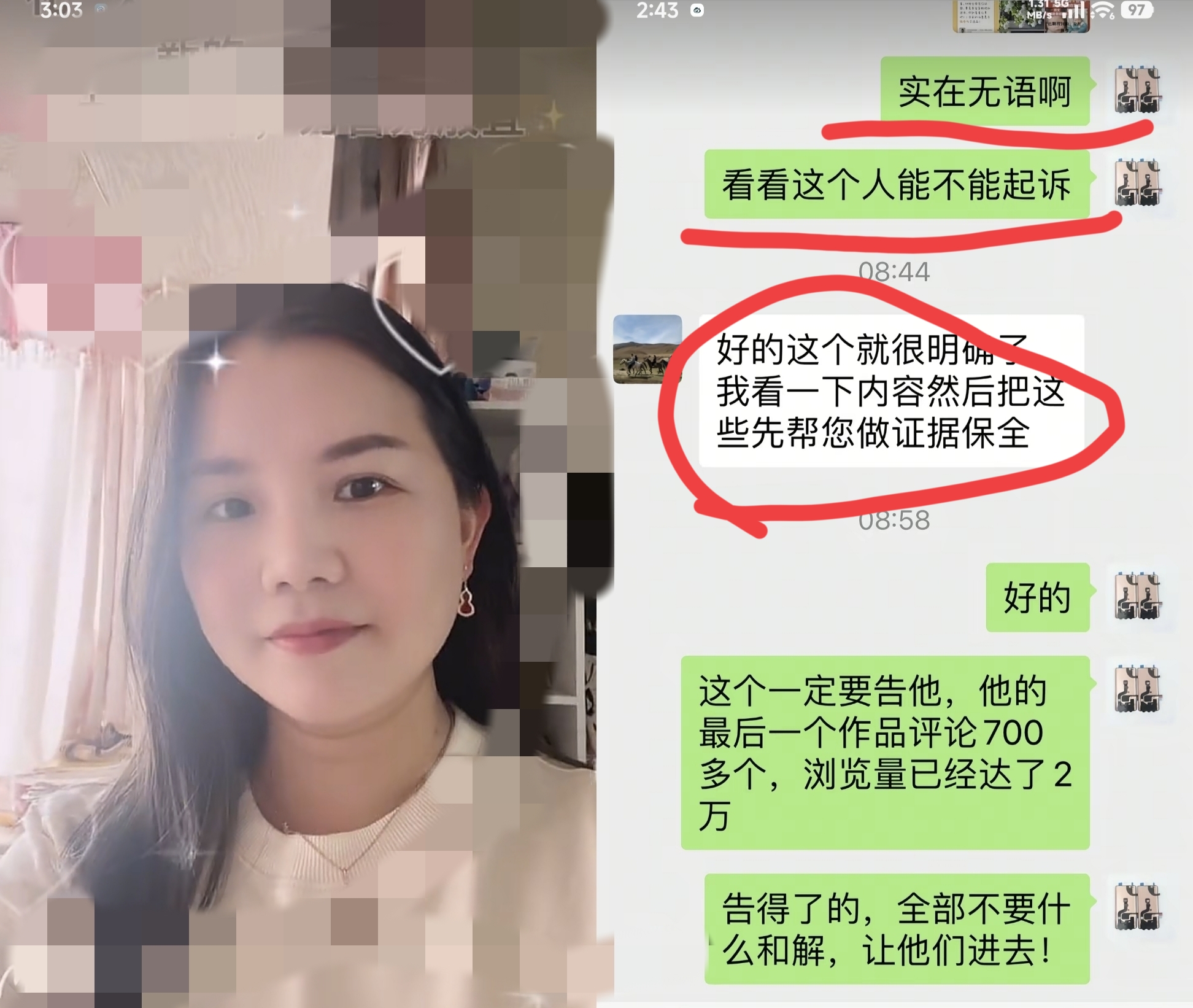 后来从李鑫养家姐姐发布的这条聊天记录可以看出李鑫养家姐姐应该是咨询了律师,而且律师也固定了证据,并且李鑫养家姐姐态度很明确,如果对方试图和解她不会同意