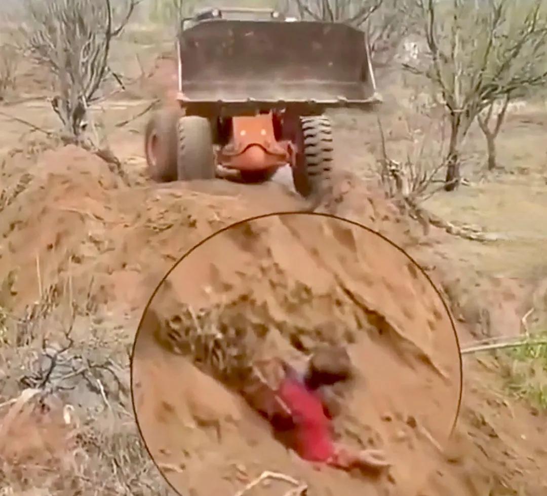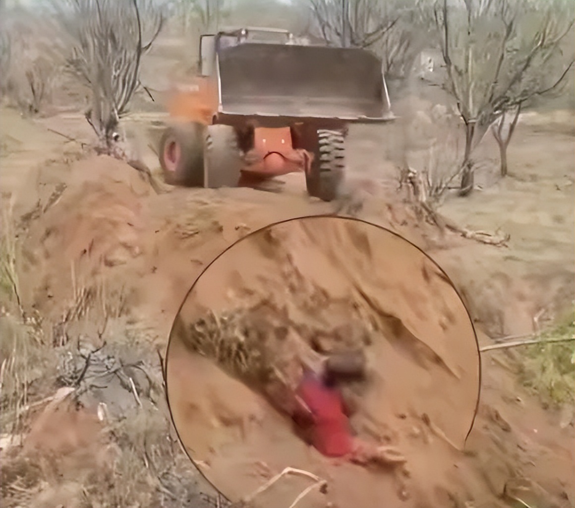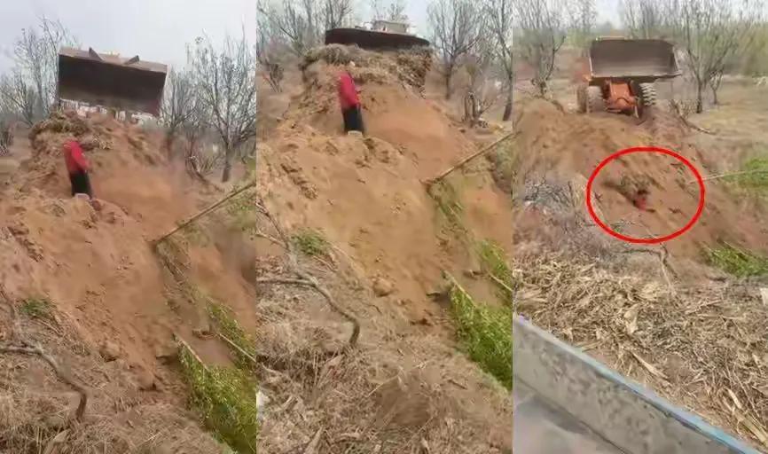 根据现场流出的视频,一名身穿红色上衣的中年男子大半截身子已经被泥土吞没,只有头部和少许肩膀露在外面。他无法动弹,表情痛苦,连呼救都显得吃力。而在距离他仅数米的地方,一辆黄色推土机还在轰轰作响,铲斗高高抬起,继续将土石倾倒在红衣男子身上。