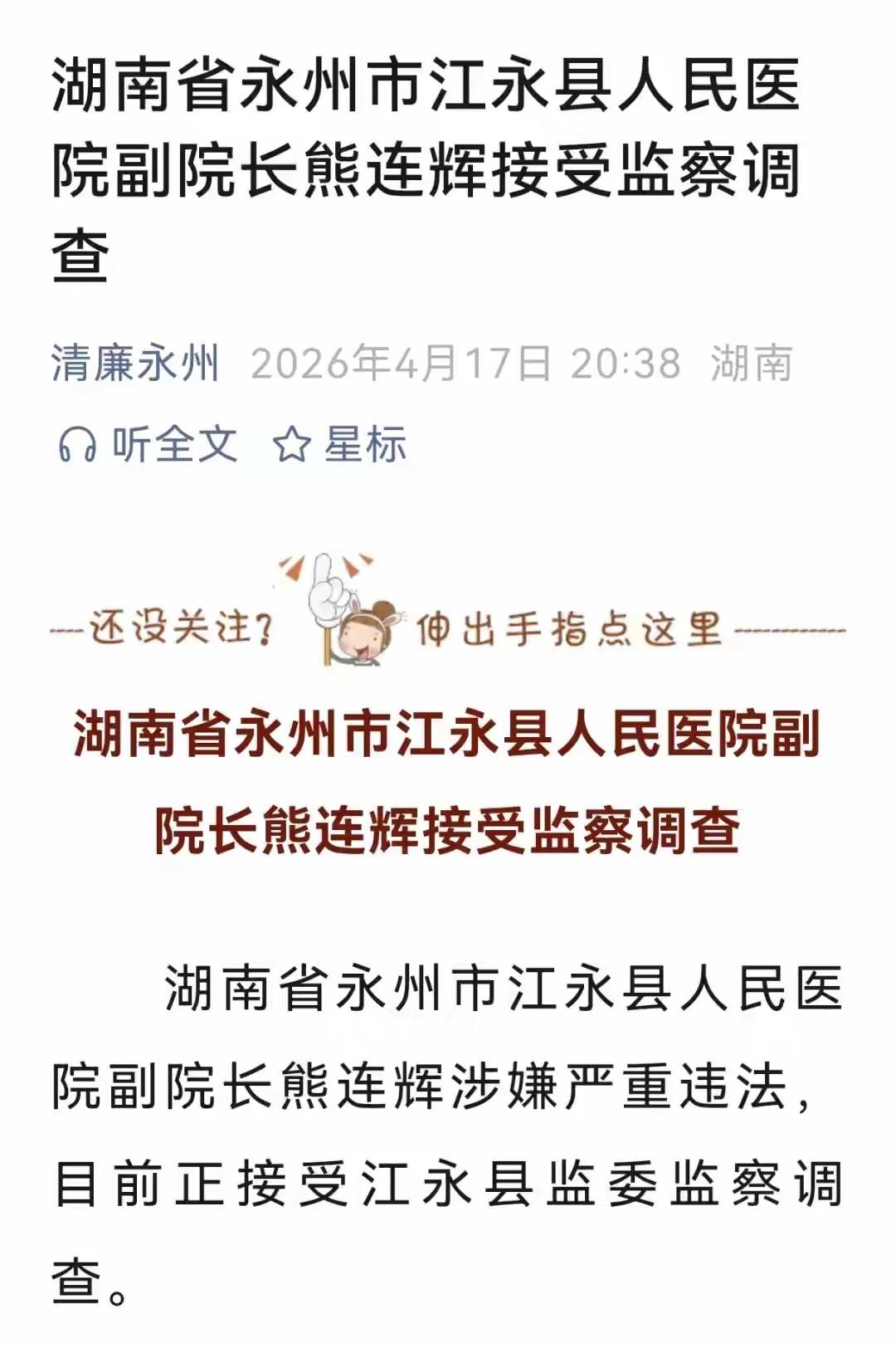 据权威消息,江永县人民医院副院长熊连辉,因涉嫌严重违法,正接受江永县监委监察调查。
