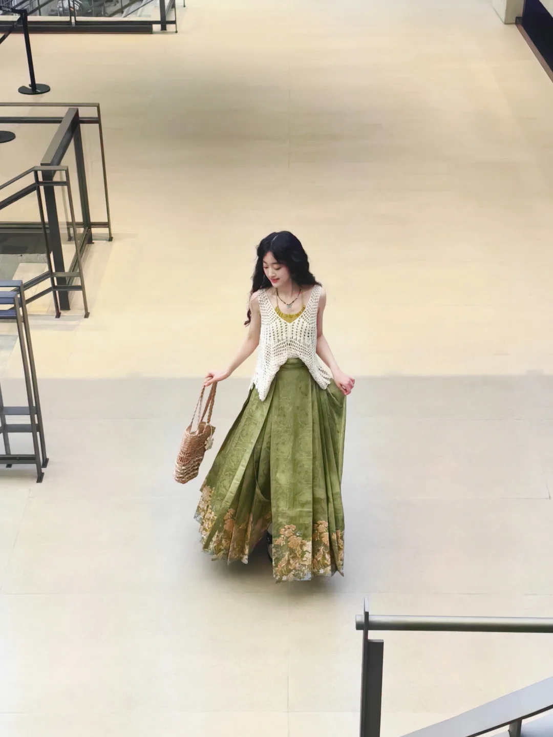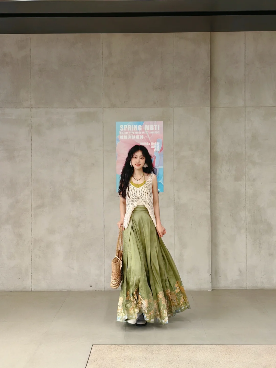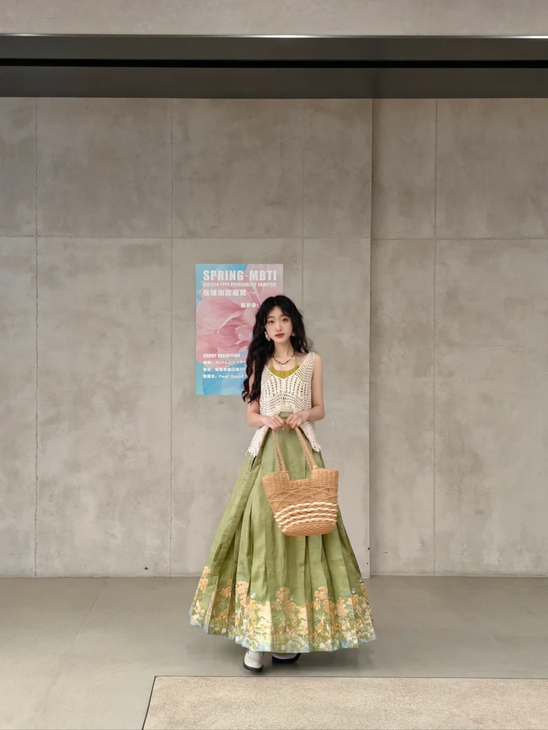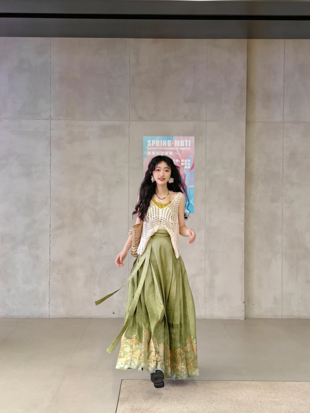 我感觉随便什么材质的绿色半身裙搭上面这身都好看,不一定要马面裙,没看出来这套搭马面裙的必要性
