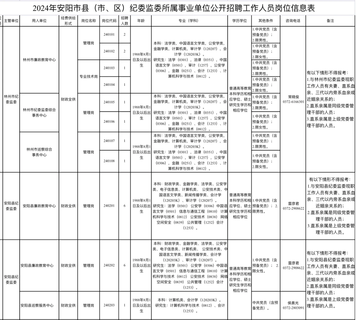 1、报名方式:采取网上报名方式进行。应聘人员请登陆安阳市人力资源和社会保障局网站,在招录公告栏点击“2024年安阳市县(市、区)纪委监委所属事业单位招聘报名入口”进入网上报名系统,进行考生注册、网上报名、查询、缴费、打印笔试准考证。