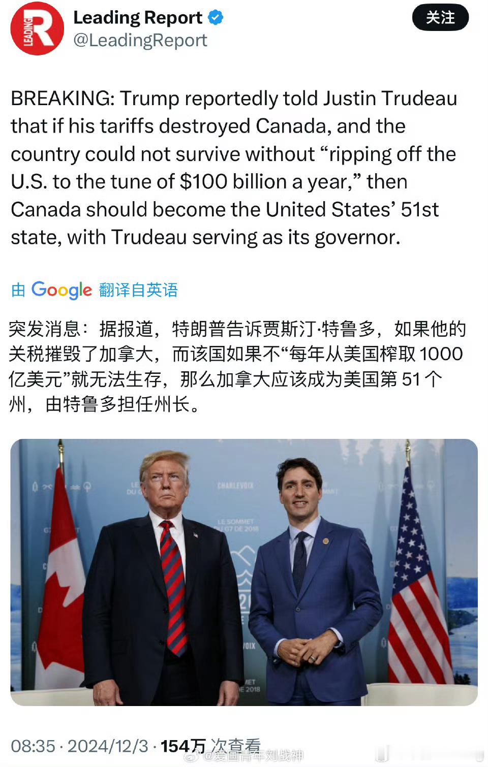 美国当选总统特朗普11月30日在海湖庄园与加拿大总理特鲁多会晤,谈到关税问题。特鲁多抱怨:如果美国加征关税,会杀死加拿大经济。特朗普开玩笑提议加拿大可成为美国第51州,特鲁多可担任州长。