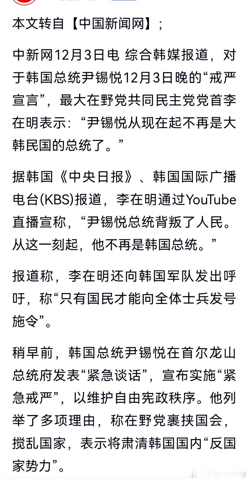 韩国最大在野党党首李在明对总统尹锡悦的“戒严宣言”作出强烈反应,称尹锡悦已背叛人民,不再是韩国总统。李在明还呼吁军队只服从国民命令。稍早前,尹锡悦实施紧急戒严以维护宪政秩序,并指责在野党与国会合谋扰乱国家。