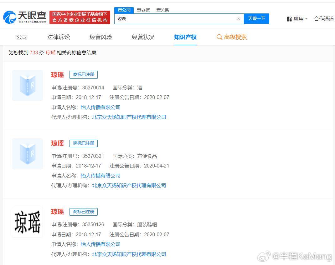 知名作家琼瑶在家去世,享年86岁!多家公司及自然人曾申请注册“琼瑶”商标,除怡人传播有限公司外,其余申请多被驳回。已有多家企业以“琼瑶”命名,涵盖贸易、珠宝、商贸、护肤品等行业。