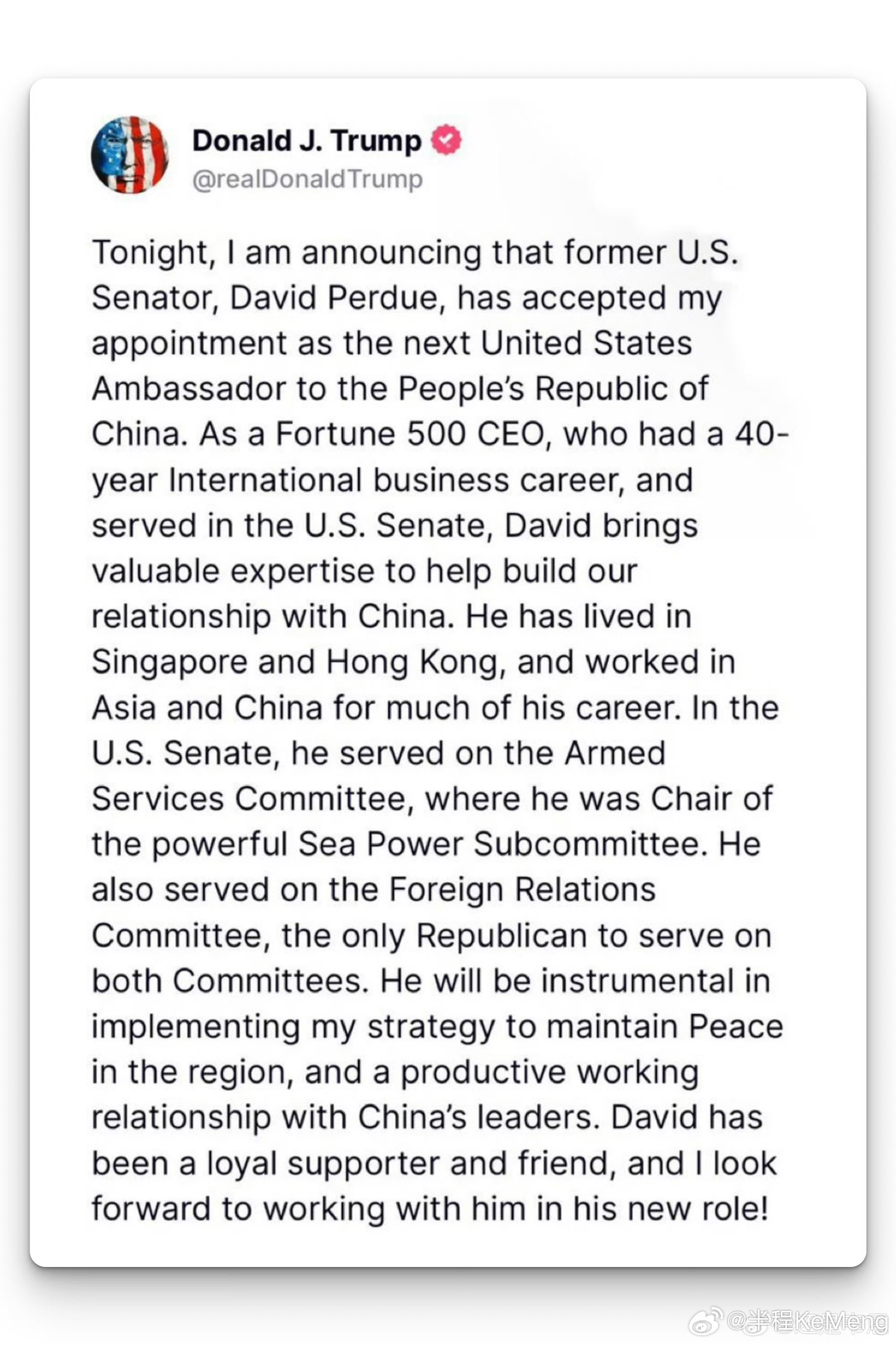 特朗普通过社交媒体宣布,提名戴维·珀杜为新任驻华大使。珀杜曾是佐治亚州联邦参议员,并担任过重要委员会的主席。特朗普认为他将实施维护地区和平的战略,并在与中国建立富有成效的工作关系方面发挥重要作用。珀杜曾是美国制造业商人,后弃商从政,并坚定支持特朗普。