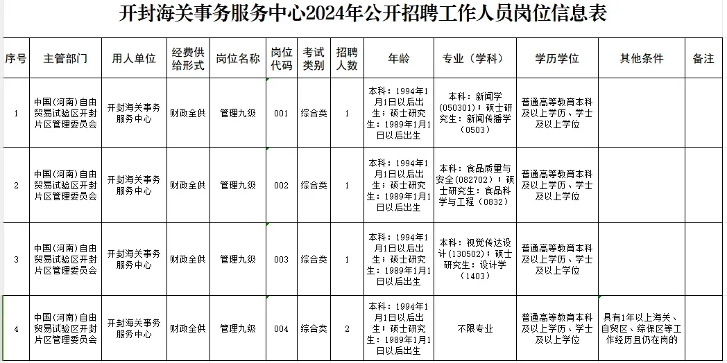 1、报名:2024年12月9日9:00至12月13日17:00。报考者登录郑州市人事考试网上报名系统后,点击“开封海关事务服务中心2024年公开招聘工作人员” 进入网上报名系统。