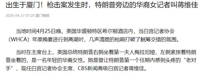 值得一提的是,华裔记者蒋维佳当时就在特朗普身边,枪响时她快速匍匐在地,之后跟着特朗普一同撤离,事后还收到了特朗普的致电,对方表示要择期重新举办这场晚宴。